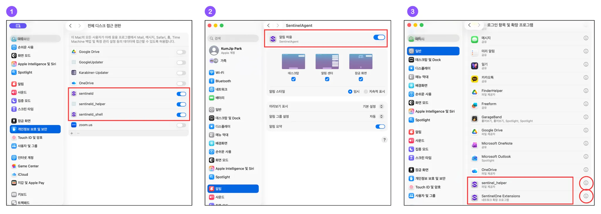 시스템설정 → 일반 → 로그인 항목 및 확장 프로그램 → 확장 프로그램 → 앱별 → SentinelOne_Extensions