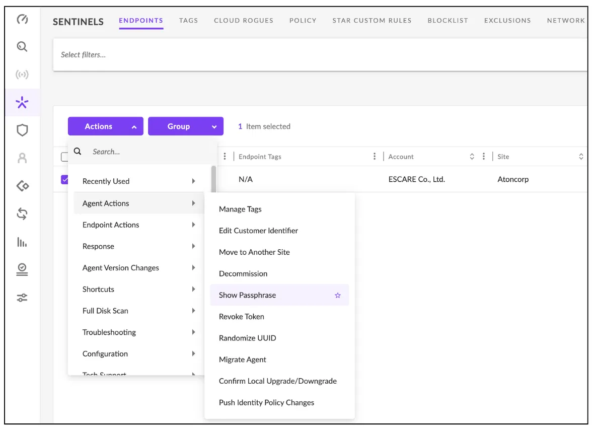 Actions → Agent Actions → Show Passphrase 메뉴를 선택하여 Passphrase 확인