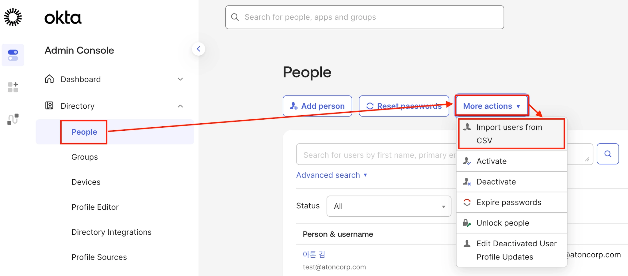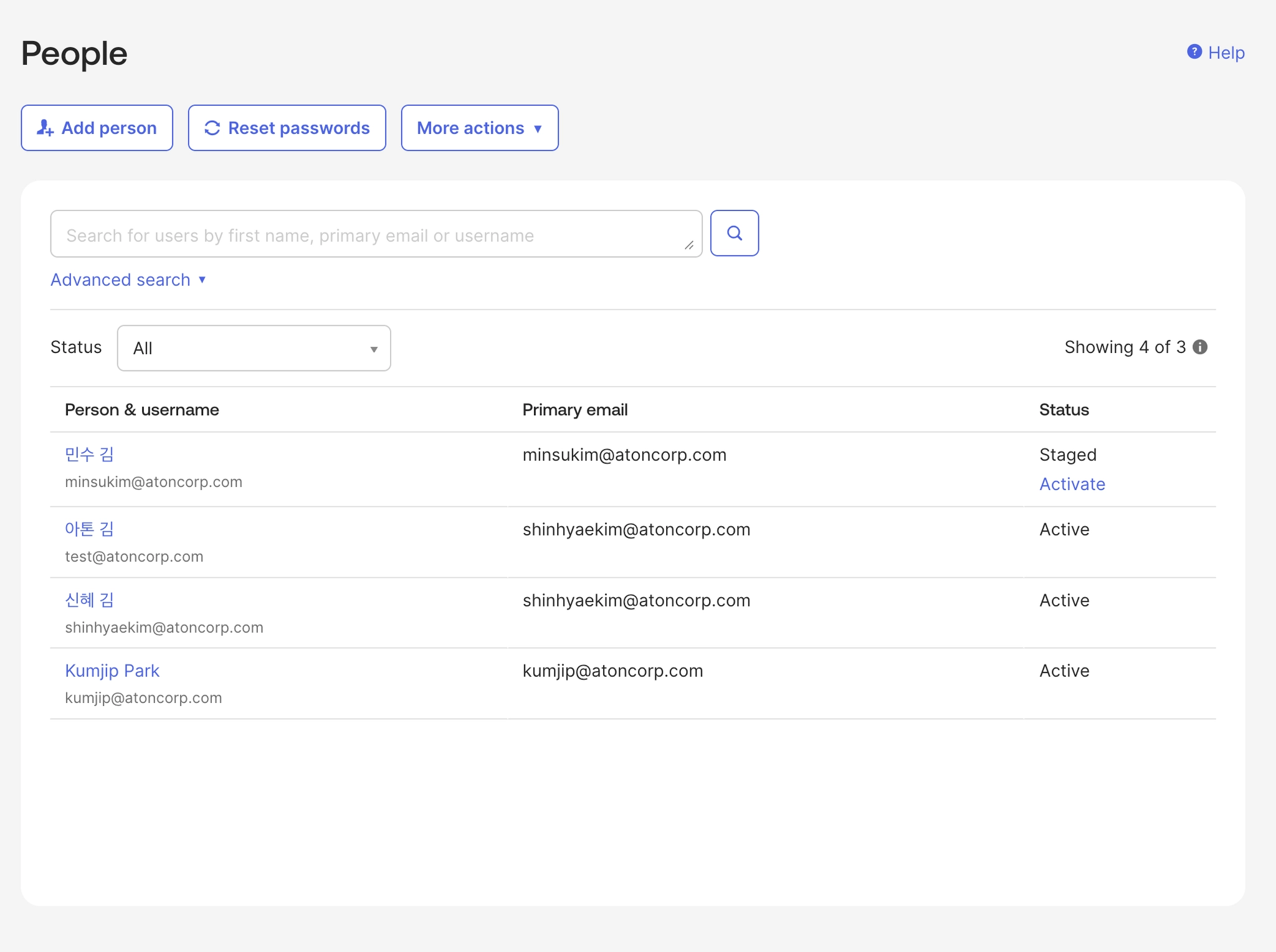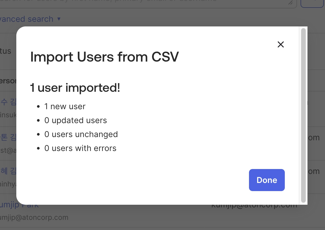 해당 이미지는 “Automatically activate new users”를 활성화하지 않고 import한 예시입니다.