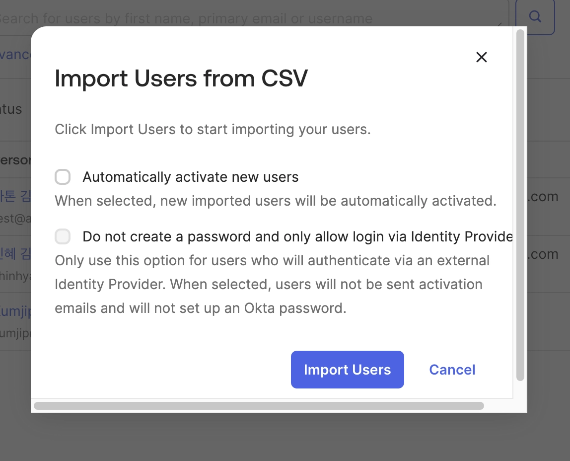 Do not create a password and only allow login via Identity Provider: 새로 가져온 사용자에게는 활성화 이메일이 전송되지 않으며 Okta 비밀번호를 설정하라는 메시지가 표시되지 않습니다. 이 설정은 외부 ID 공급자를 사용하여 인증하는 사용자에게만 권장됩니다.