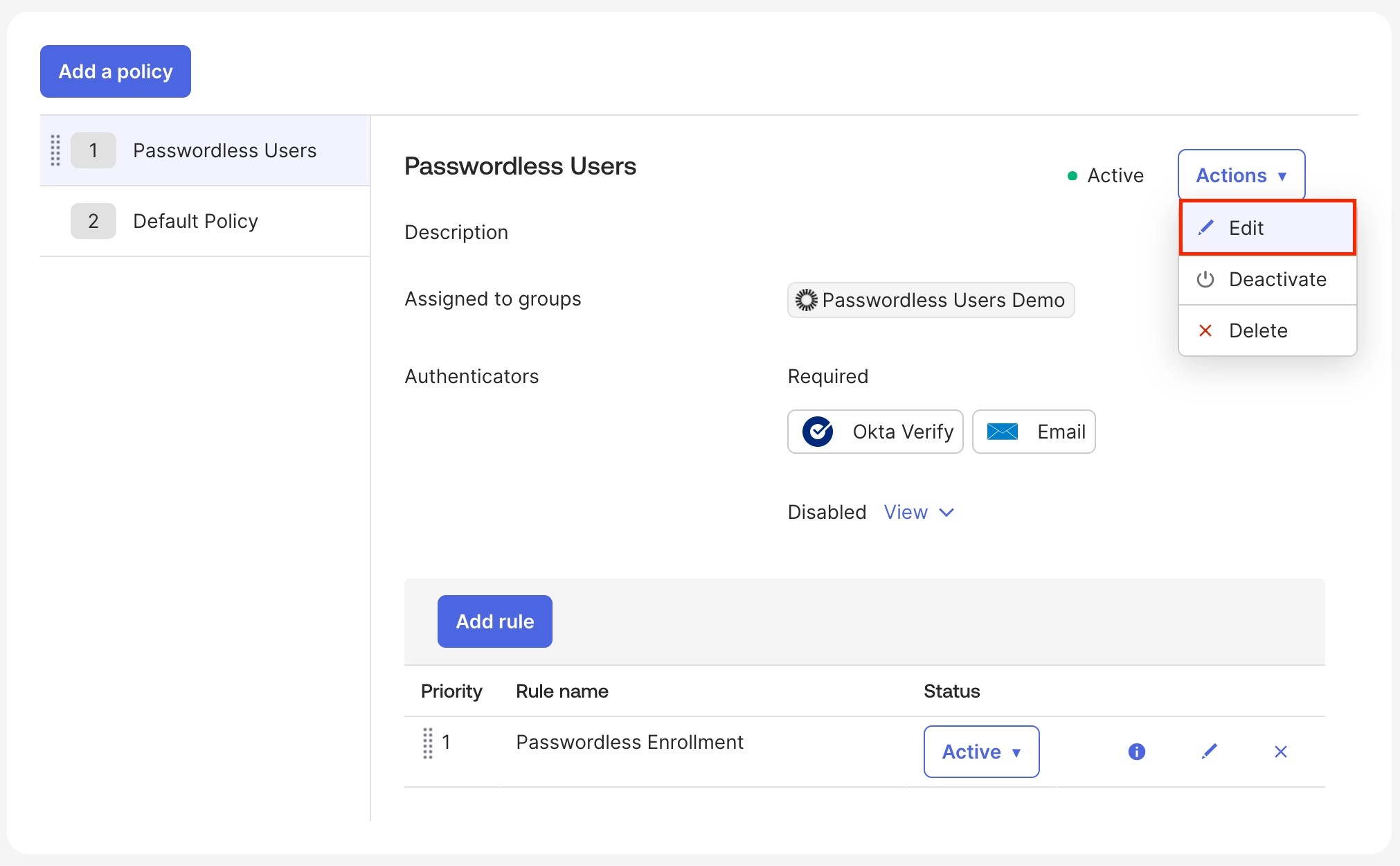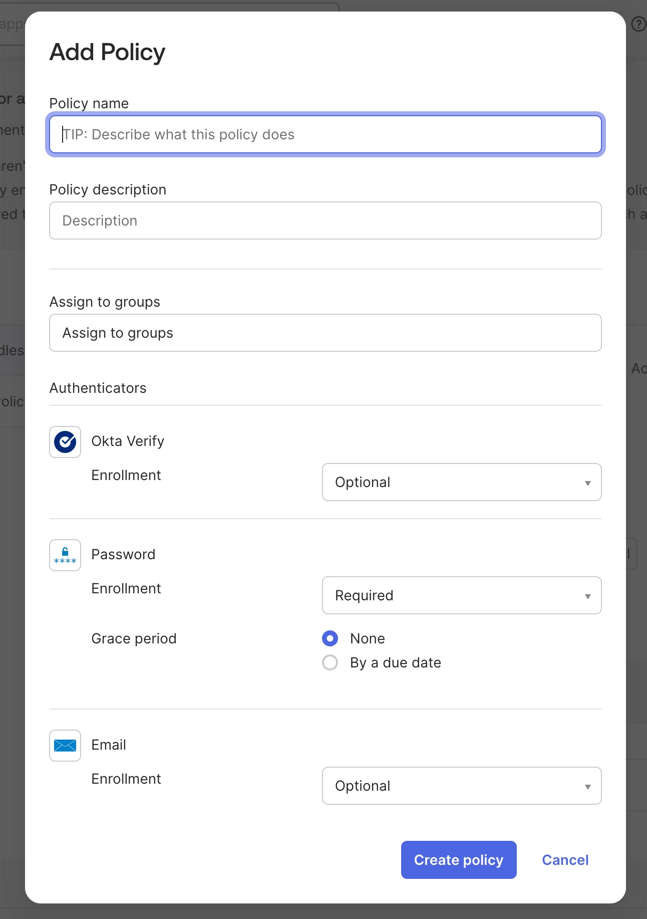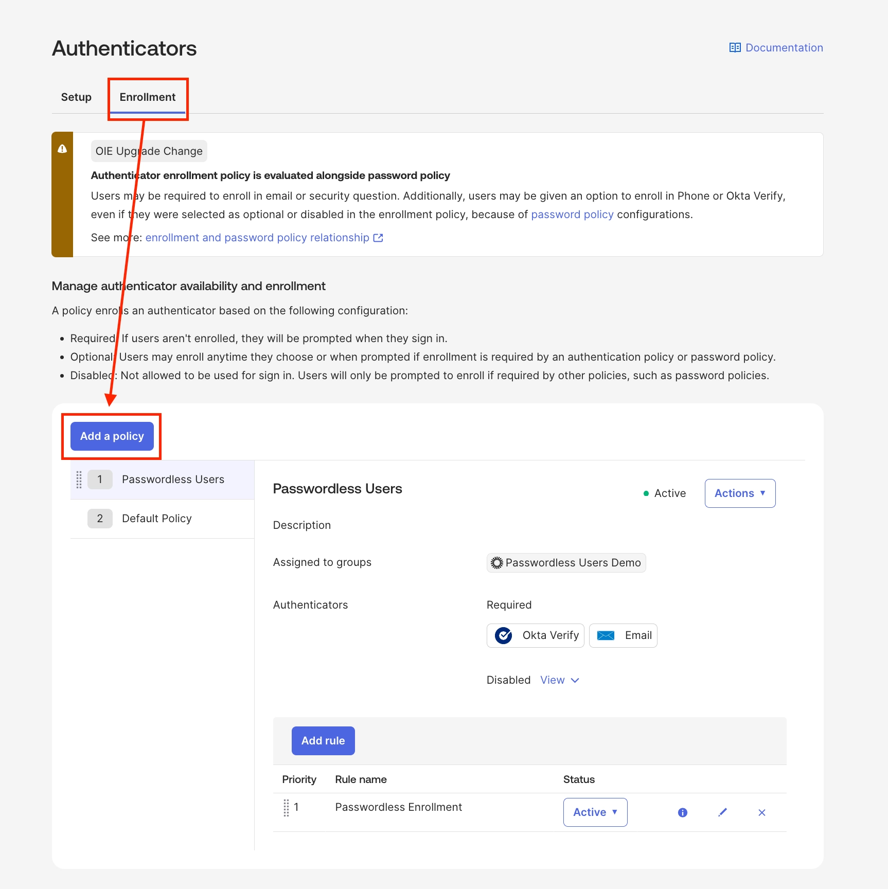 신규 정책 추가: Authenticators → Enrollment → Add a policy