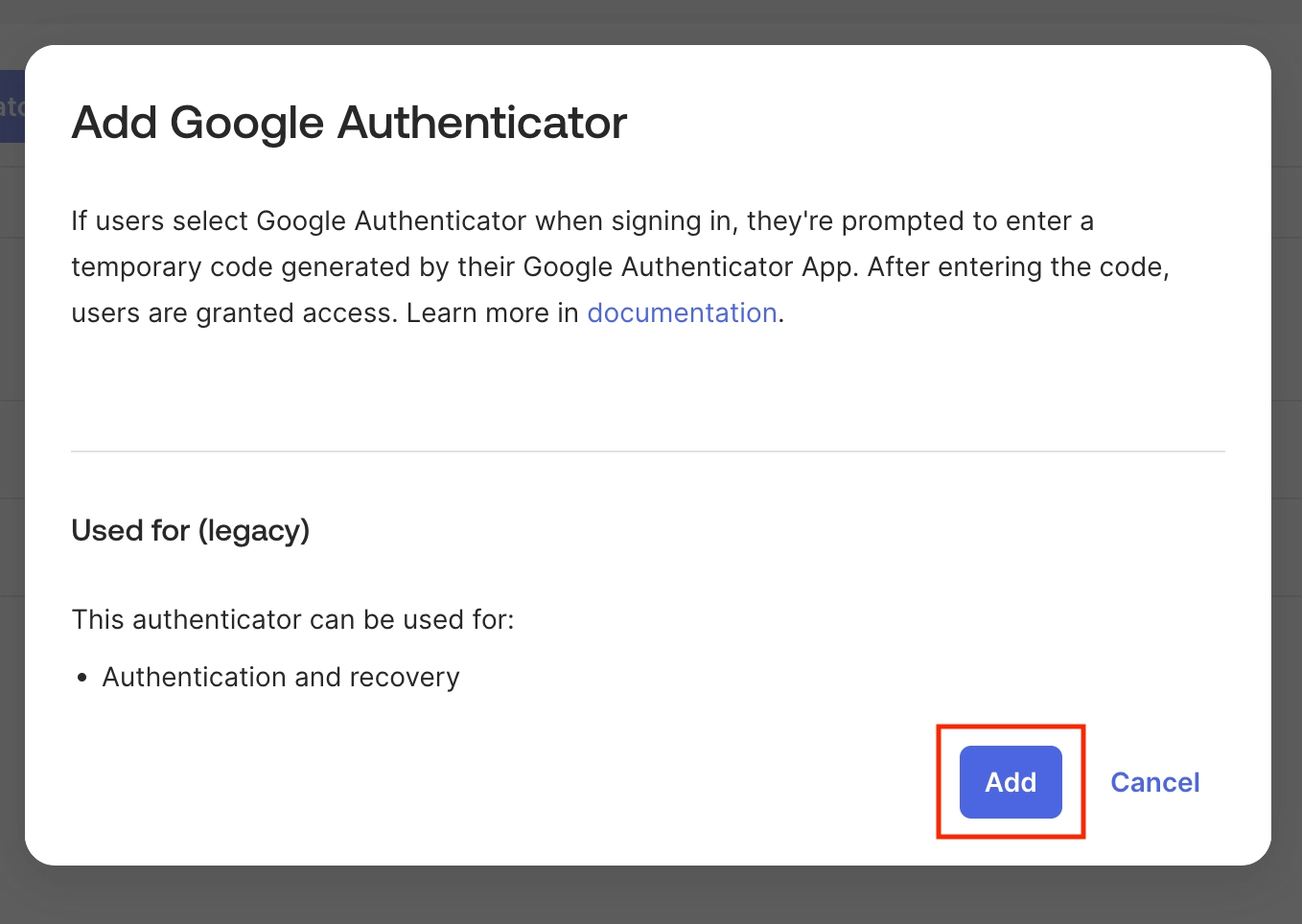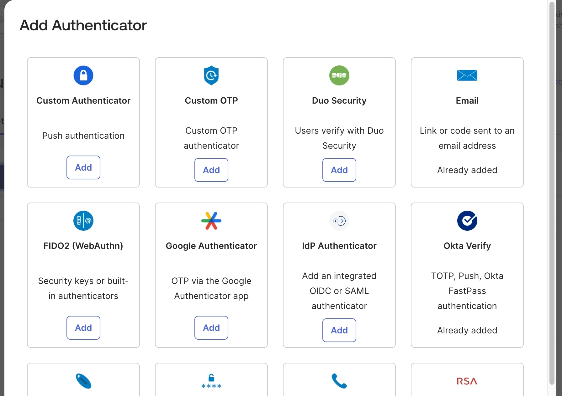 목록에서 활성화할 인증 수단을 선택해서 “Add” 클릭합니다.