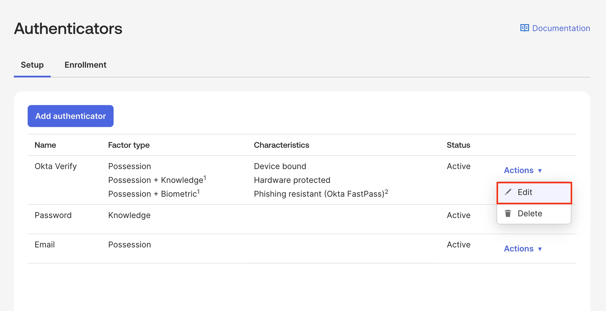 활성화한 인증 수단에 대한 수정도 “Edit”을 통해서 가능합니다.