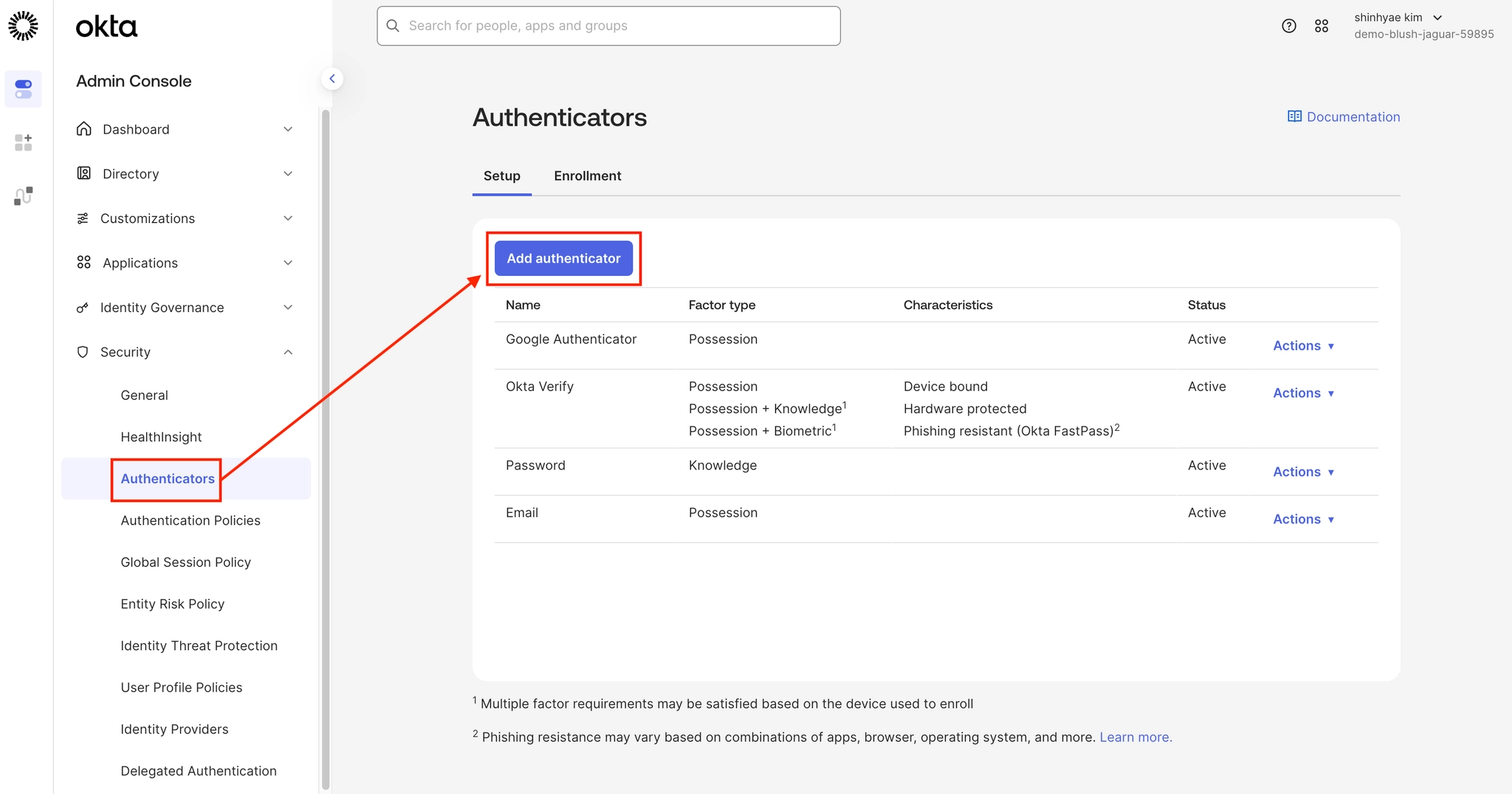 사용자가 Okta 로그인 시 본인 인증을 할 수 있도록 다양한 인증 수단을 설정 및 등록할 수 있습니다.