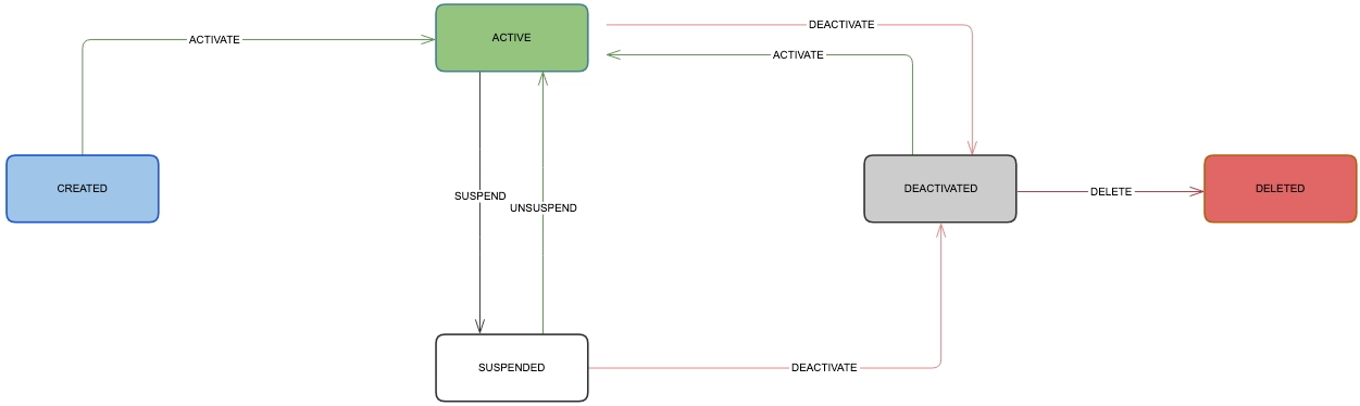 Depending on the current device state, different device state buttons are available. You can Suspend or Deactivate (if Active), Unsuspend (if Suspended), and Activate or Delete (if Deactivated):