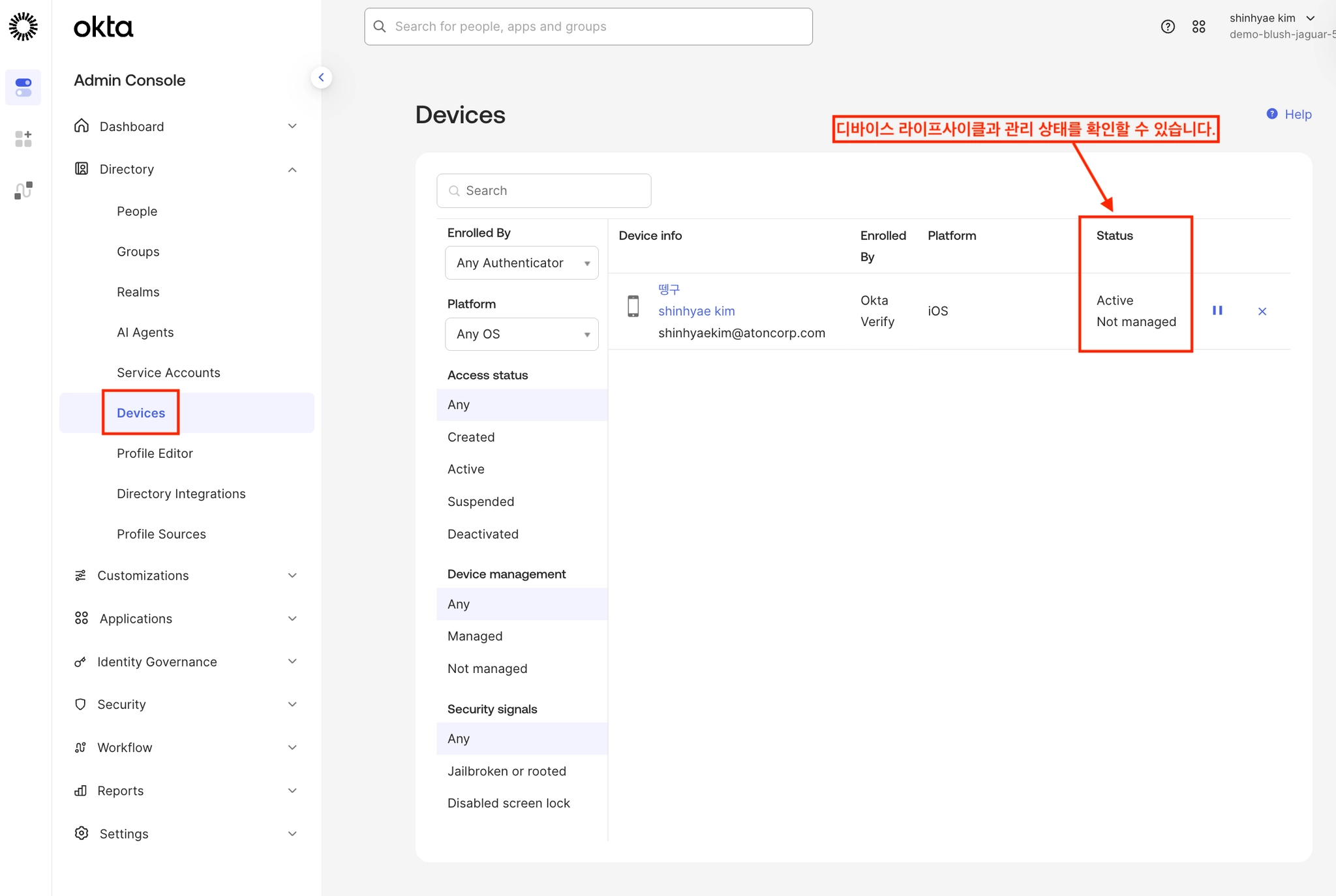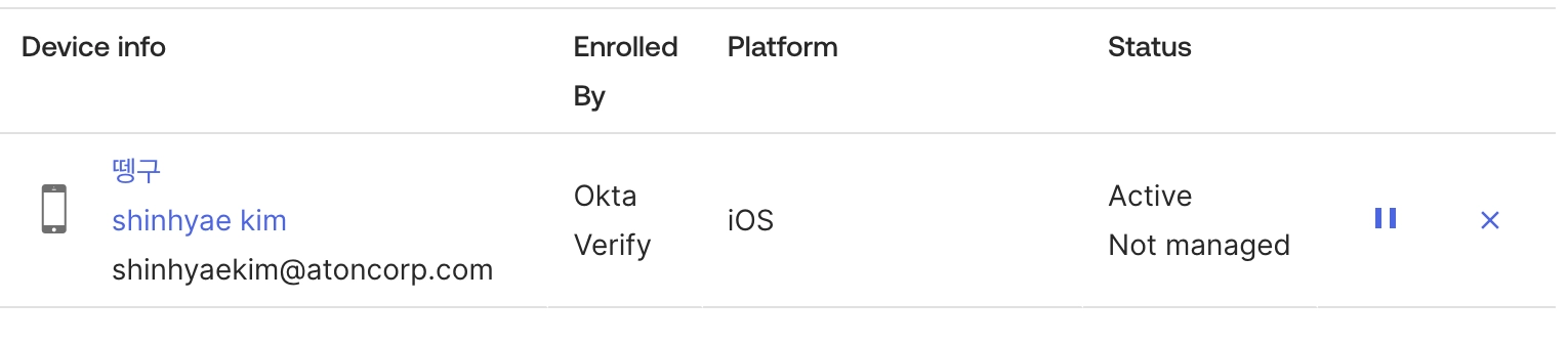 Active | Active 상태의 디바이스는 Suspended 또는 Deactivated 상태가 될 수 있습니다.