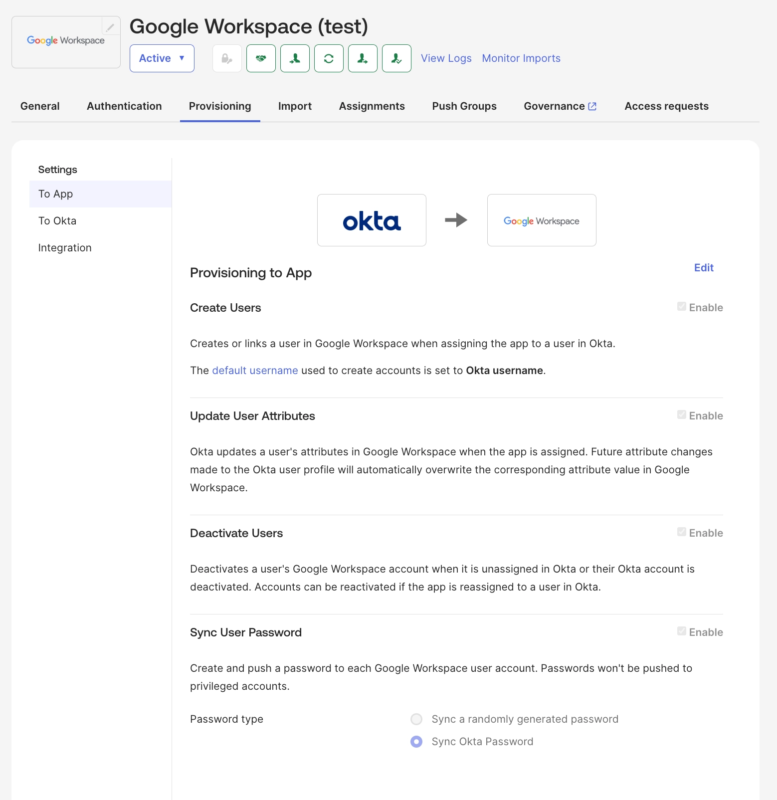 Sync User Password: Okta에서 변경된 사용자 비밀번호를 Google Workspace 계정에도 동기화할 수 있습니다.