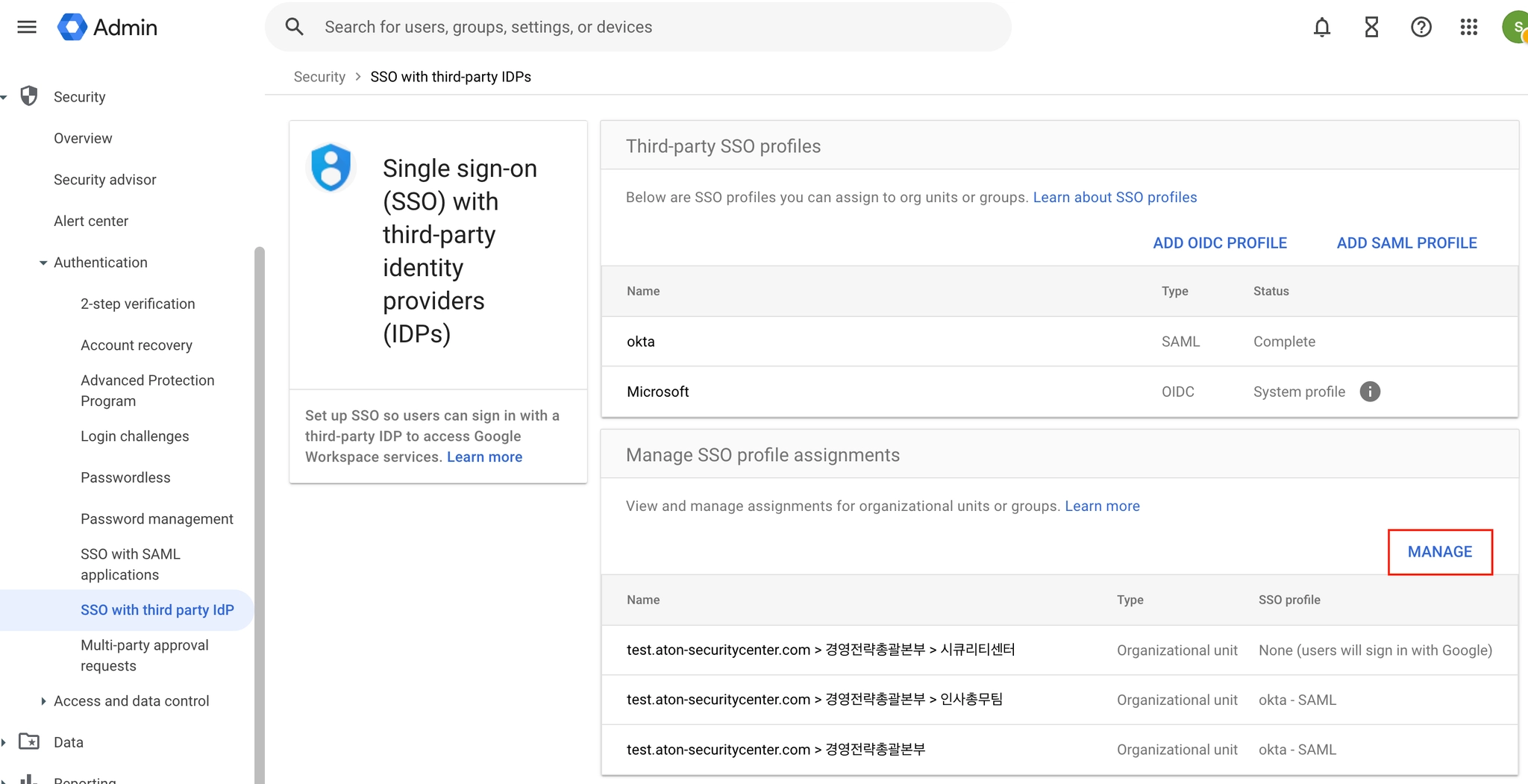 IdP 등록 후, “MANEGE”에서 어떤 조직(Organization Unit)에 등록한 IdP 중 어떤 IdP를 사용할 것인지 선택이 가능합니다.