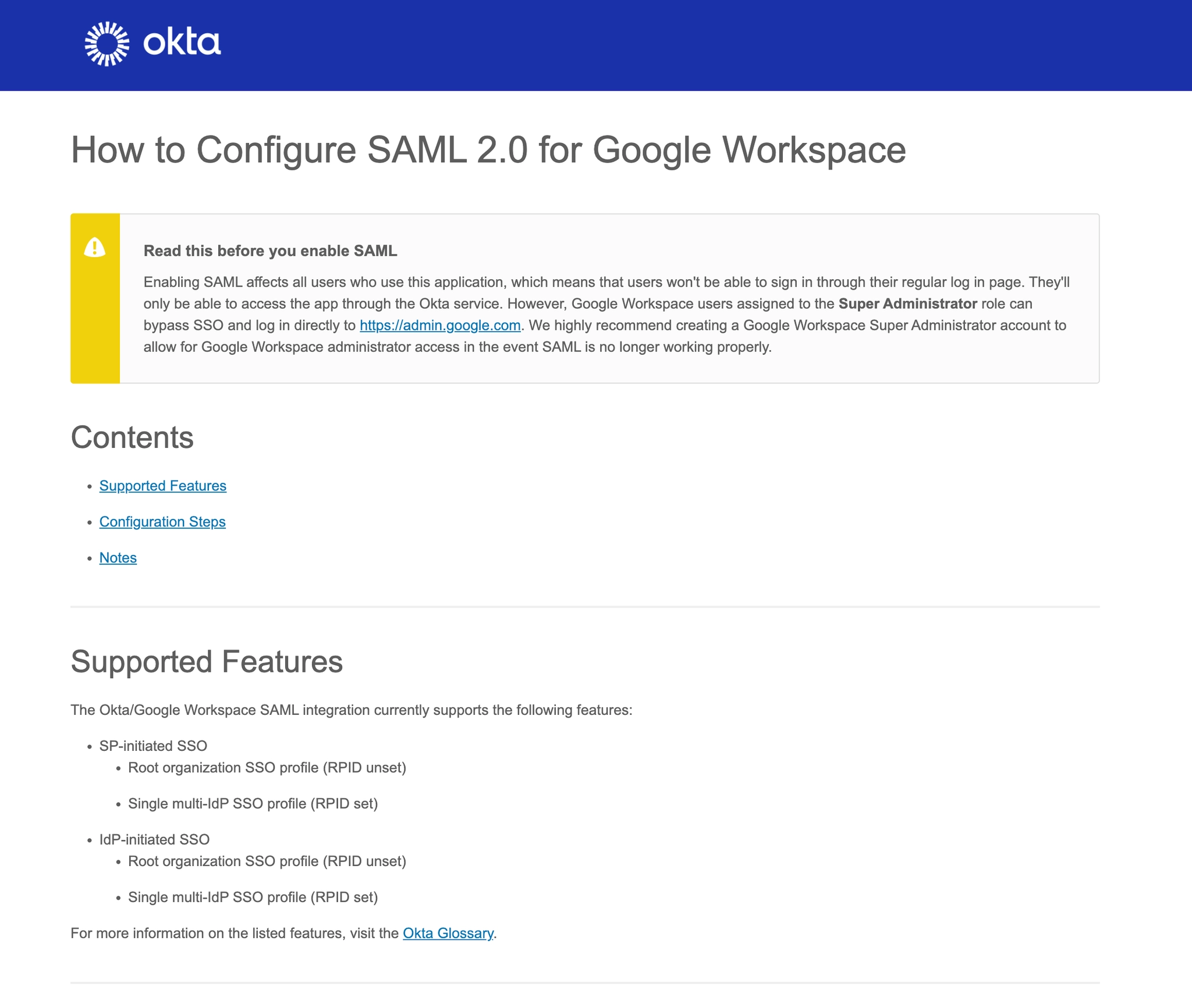 Okta를 SAML을 통해 Google Workspace에 연결할 때 다음과 같은 기능이 지원됩니다.