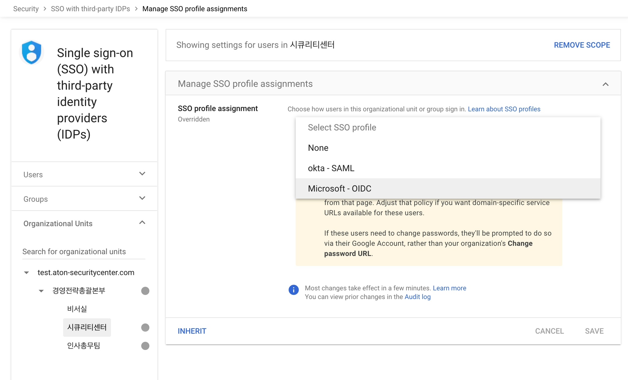 테스트를 진행할 조직(Organization Unit)를 선택해서 “okta-SAML”를 선택하고 “SAVE”를 클릭합니다.