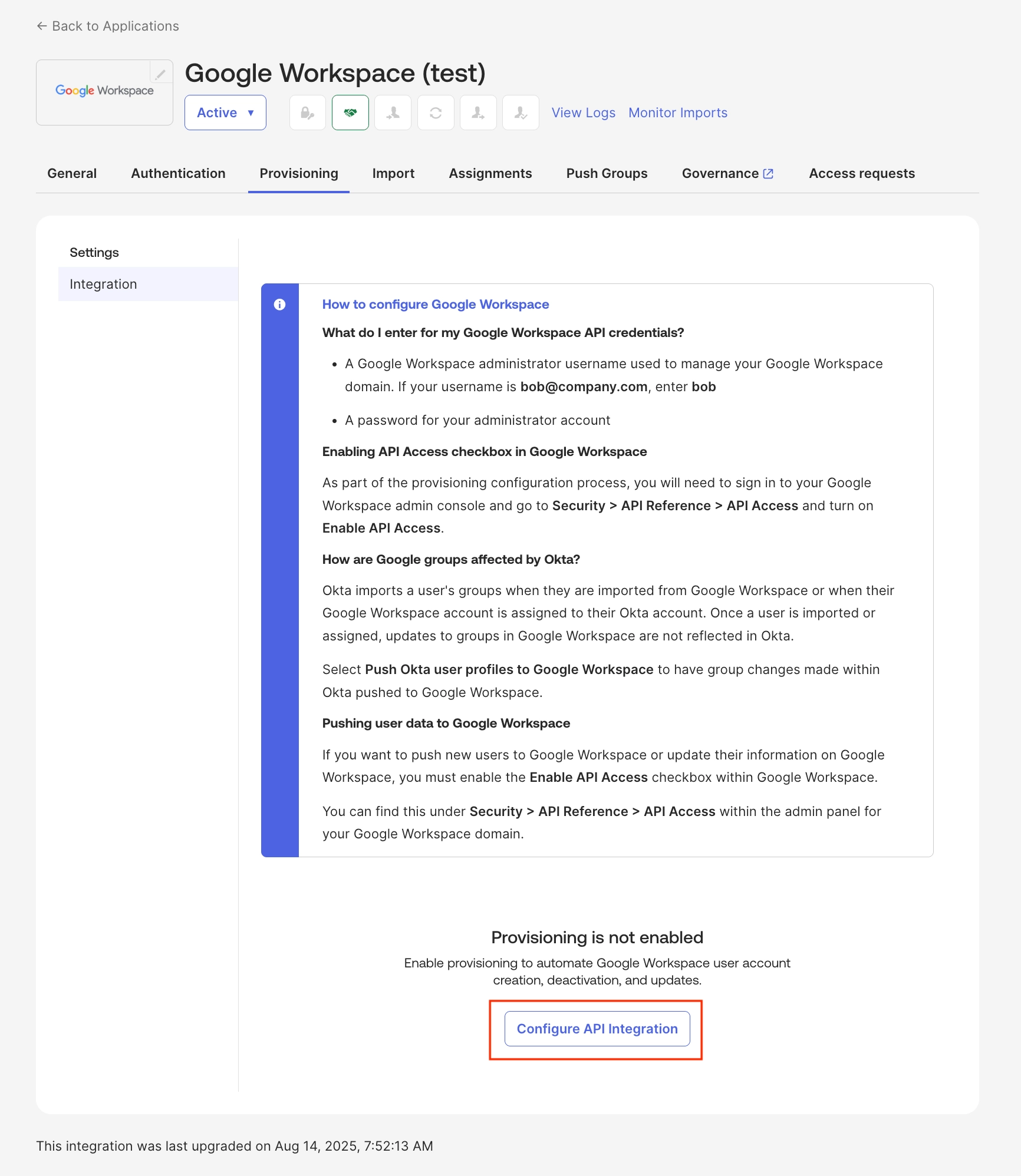 경로: Okta 관리자 콘솔 → Application → Application → Google Workspace 앱 → Provisioning → Configure API Integration 클릭