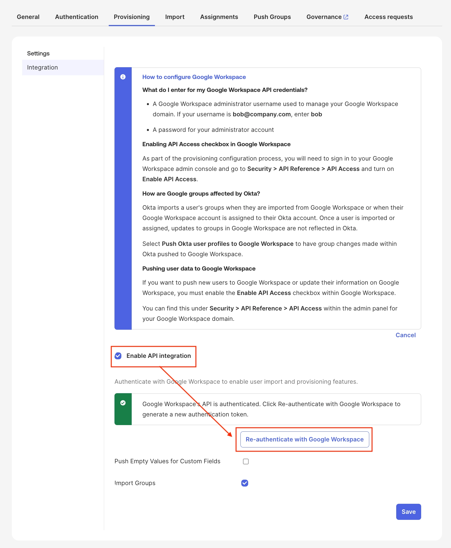 Step 3. Okta GWS 앱에서 프로비저닝 설정