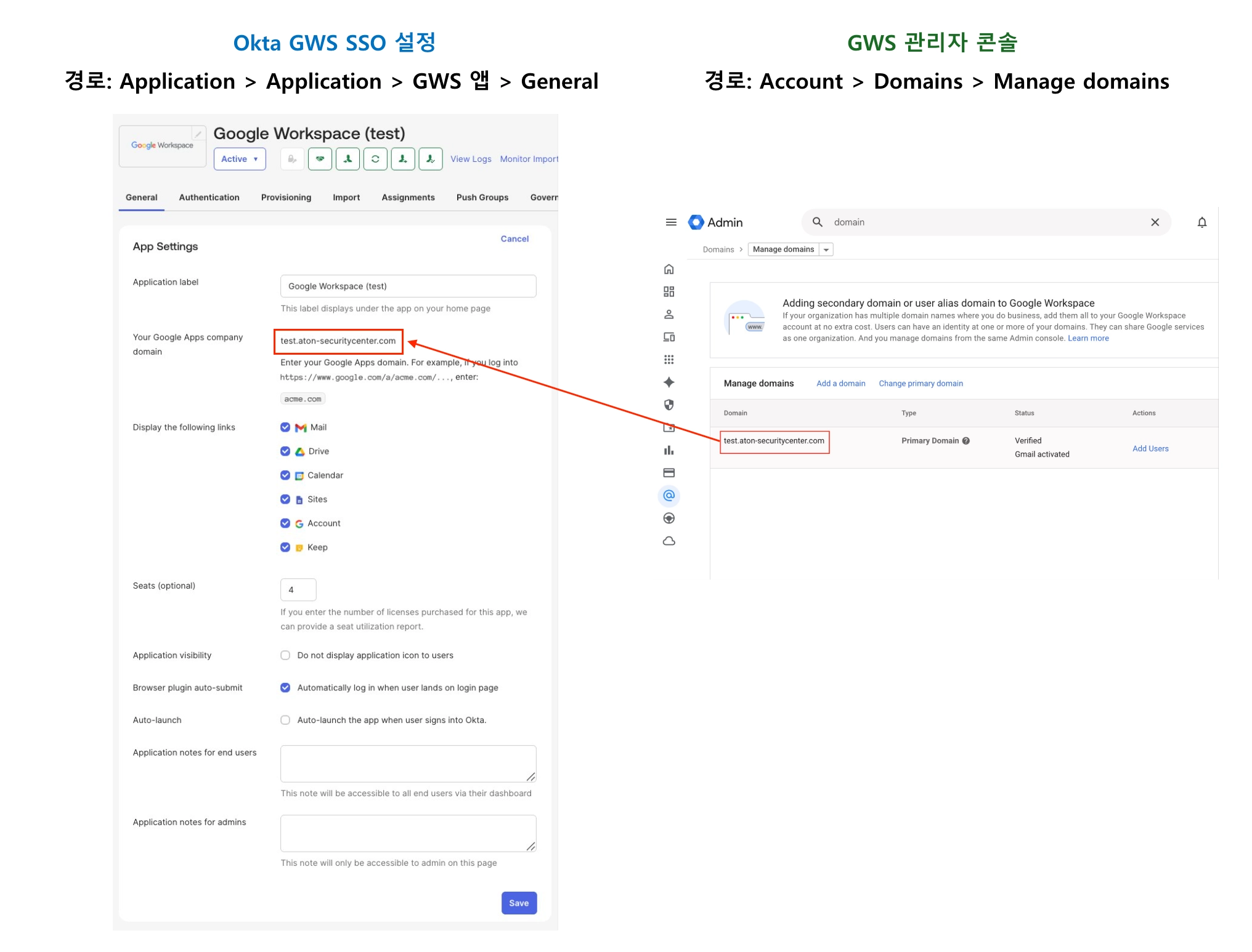GWS의 ‘기본 도메인(Primary Domain)’을 기준으로 구성합니다.