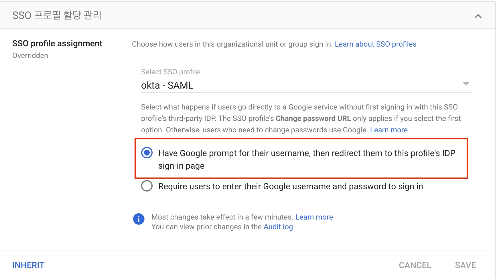 Require users to enter their Google username and password to sign in: 사용자가 IDP로 리다이렉션되지 않고 구글에서 로그인할 수 있습니다.
