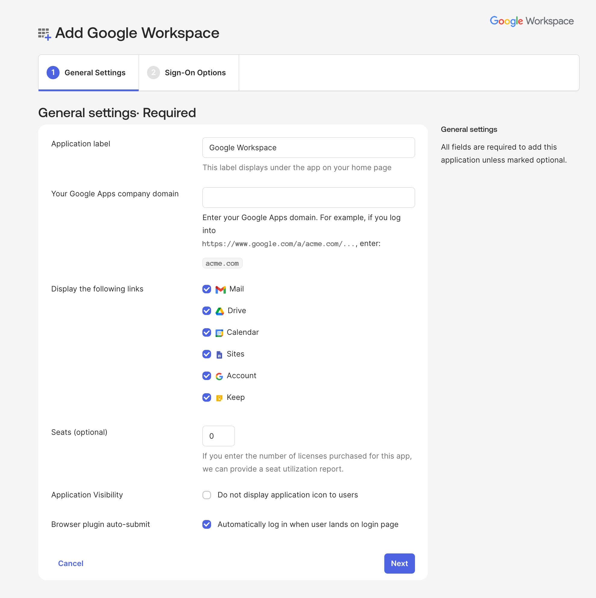 Seats(옵션): 라이선스 관리 및 모니터링을 위한 항목, 현재 구매한 GWS 라이선스 수량을 입력해 두면 Okta를 통해 할당된 사용자 수와 비교하여 라이선스 현황을 관리하는 용도로 사용
