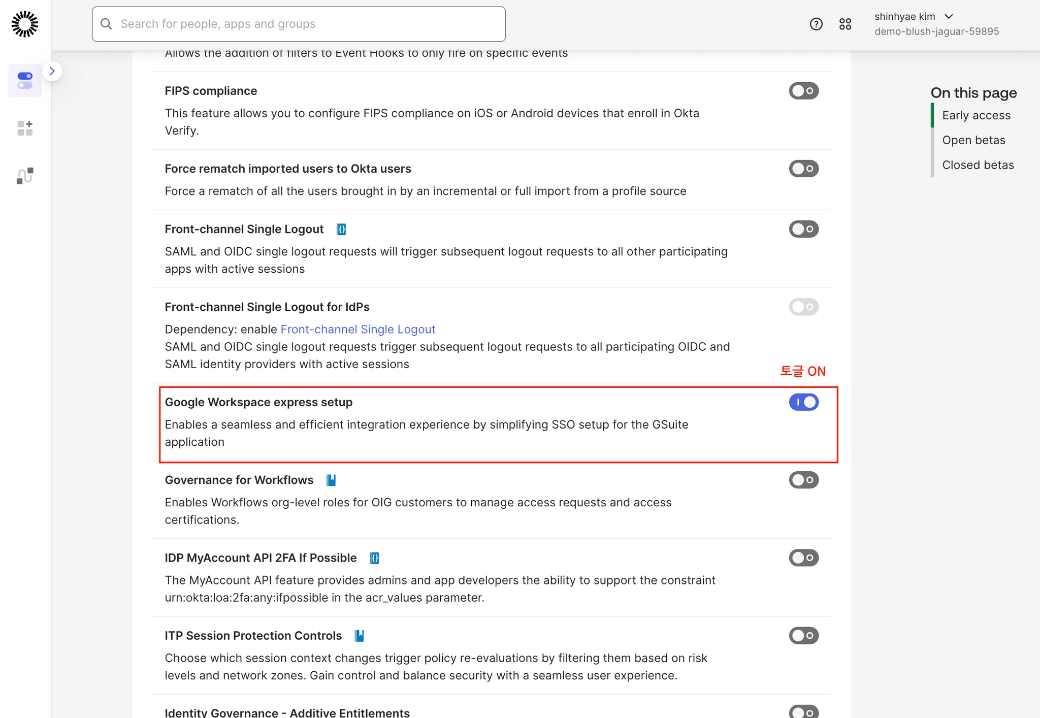 경로: Settings → Features → Google Workspace express setup 토글 ON