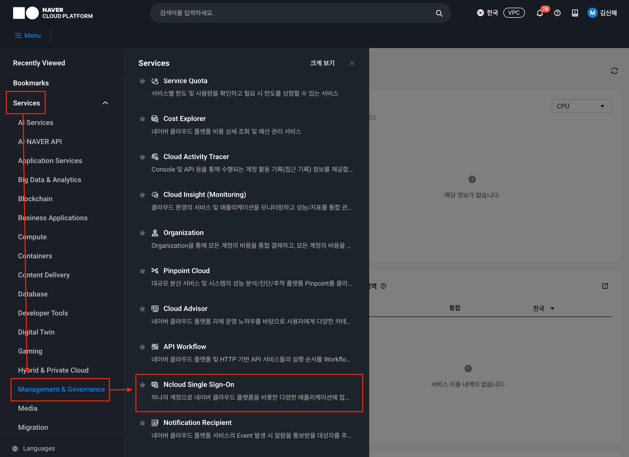경로: 콘솔에서 > Services > Management & Governance > Ncloud Single Sign-On