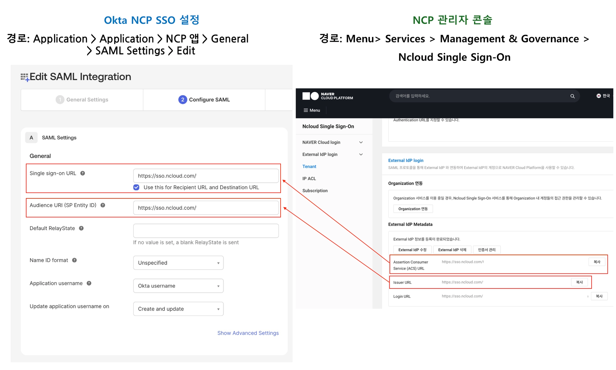Ncloud Single Sign-On 서비스와 IdP를 연동하려면 IdP에서 전달하는 SAML 응답을 수신할 엔드포인트인 Assertion Consumer Service (ACS) URL 정보와 IdP를 식별하는 Issuer URL 정보가 필요합니다.