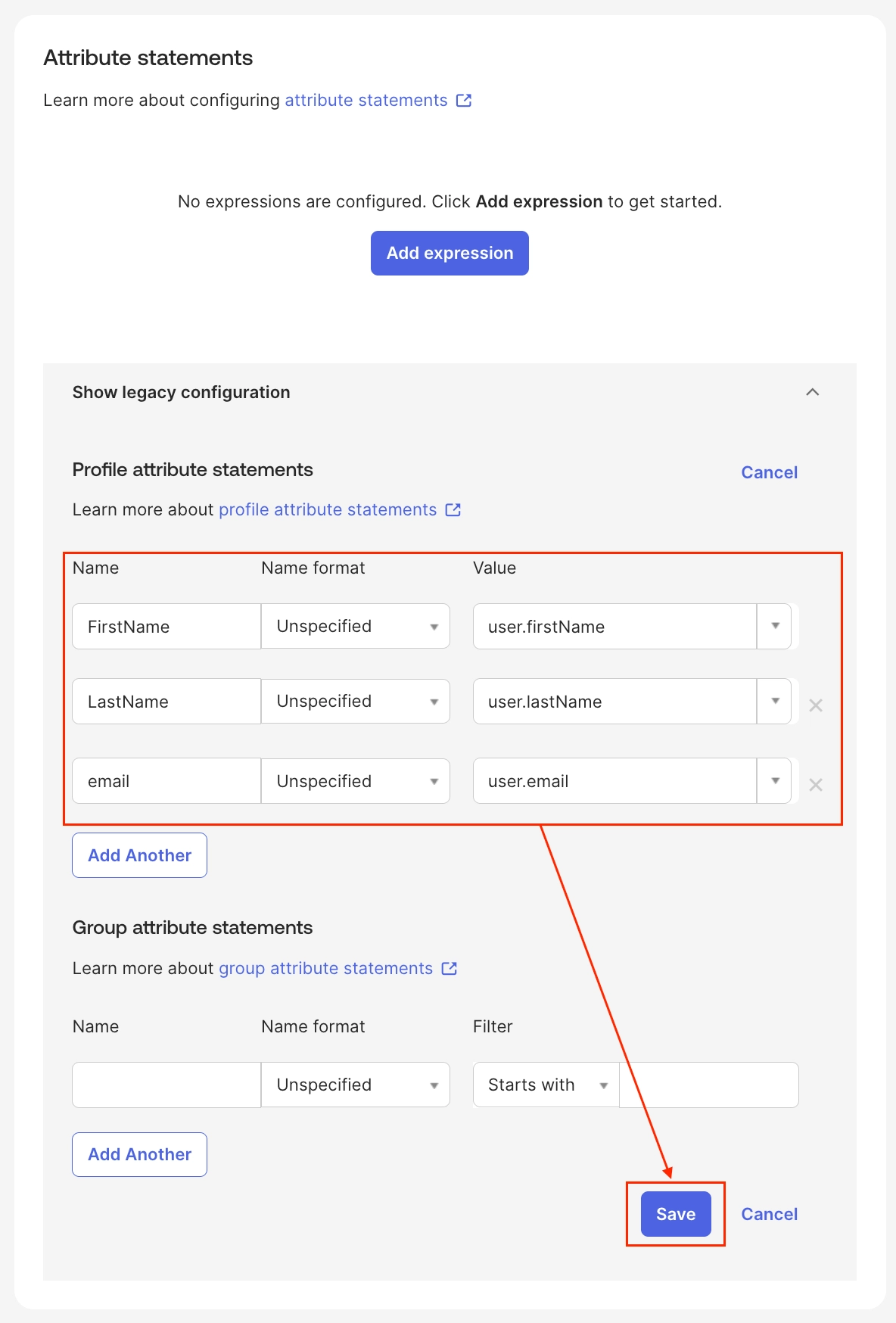 Attribute Statements 영역에서 Okta에서 네이버 클라우드 플랫폼으로 전달할 Attribute를 다음과 같이 설정합니다.