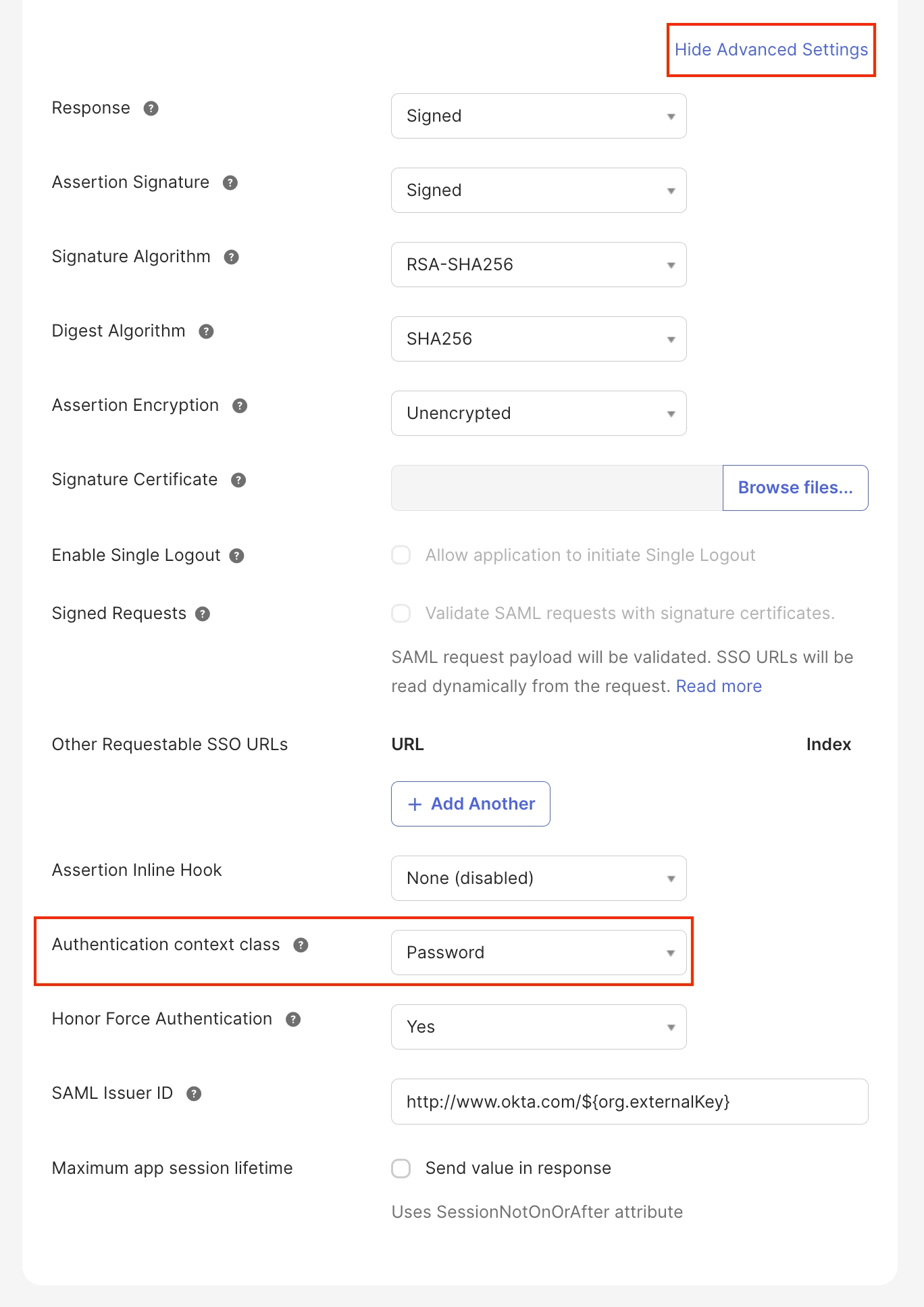 General 영역의 “Show Advanced Settings”를 클릭하고, Authentication context class를 Password로 변경합니다.