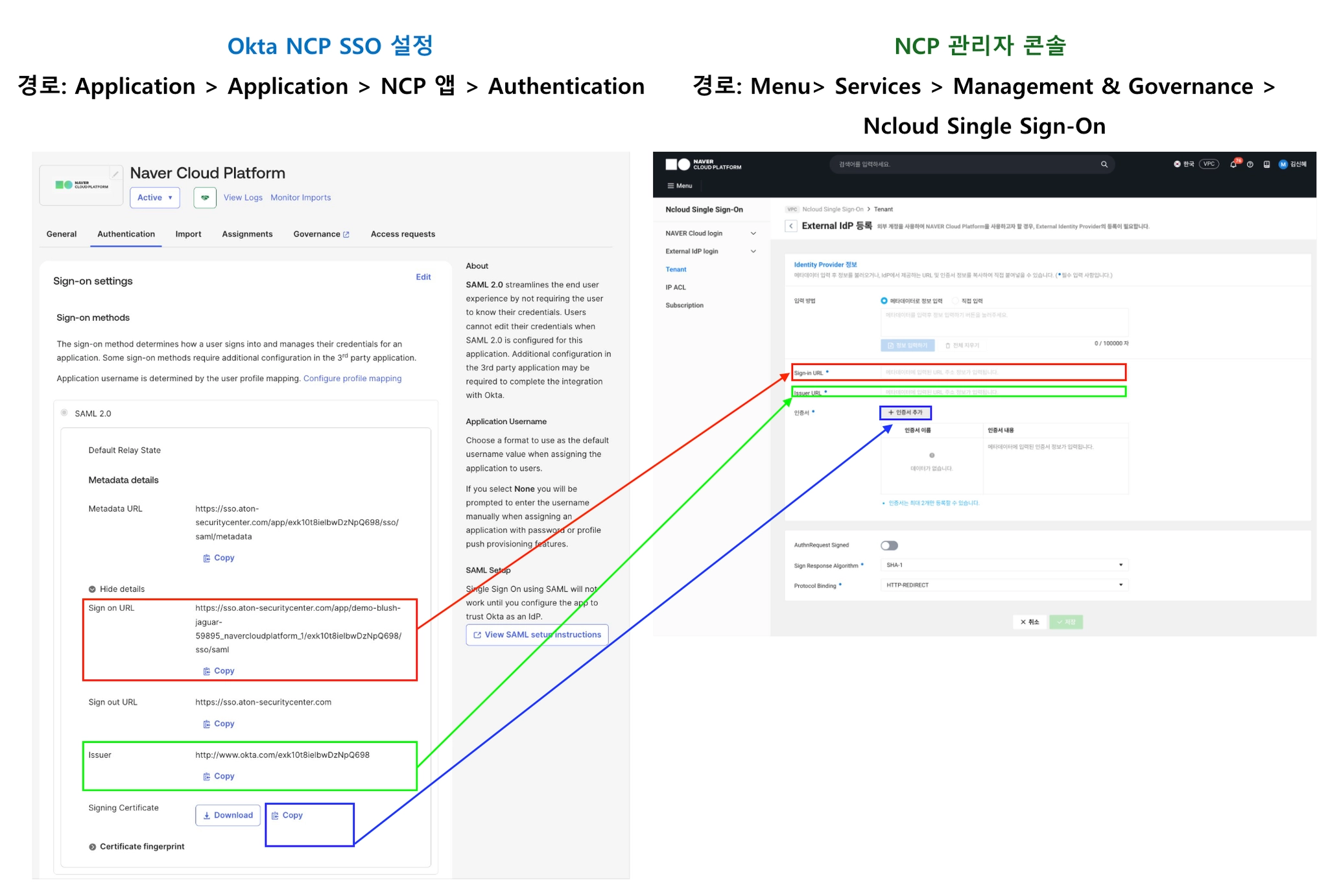 네이버 클라우드 플랫폼의 ACS URL과 Issuer URL을 확인하는 방법은 다음과 같습니다.