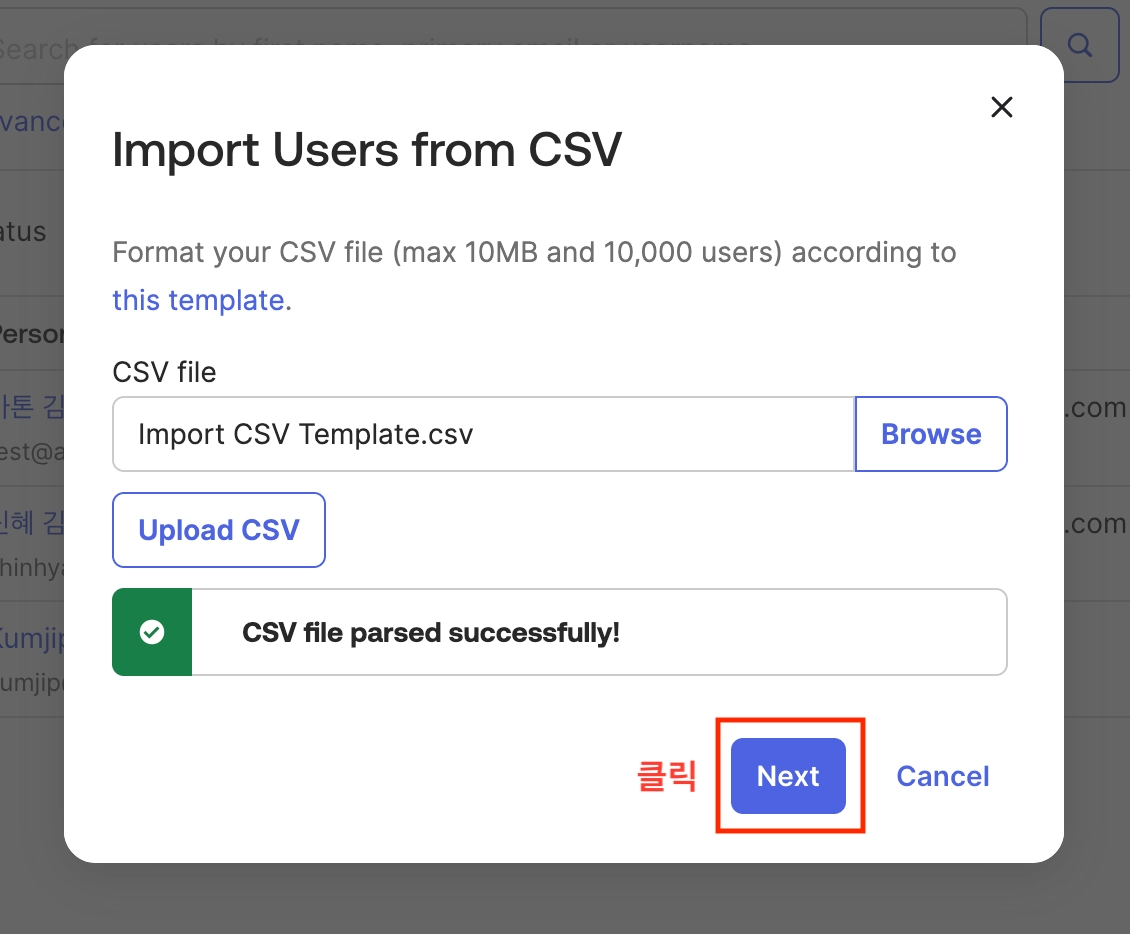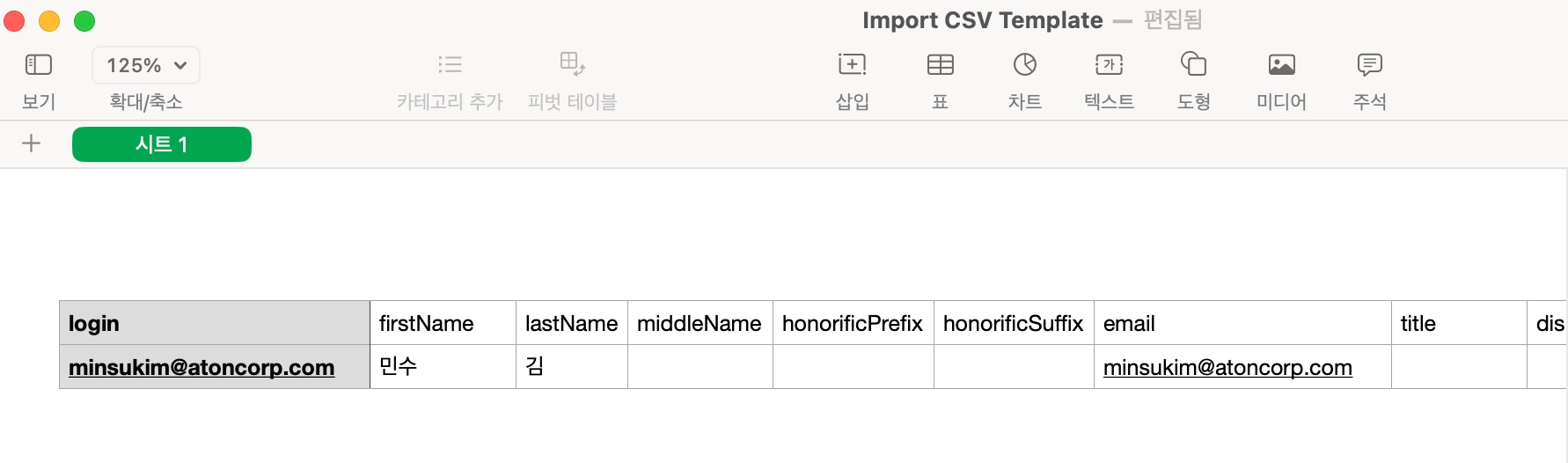 이후 행에는 각 행마다 한 명의 사용자가 포함되어야 하며 모든 필수 정보가 올바른 열에 입력되야 합니다.