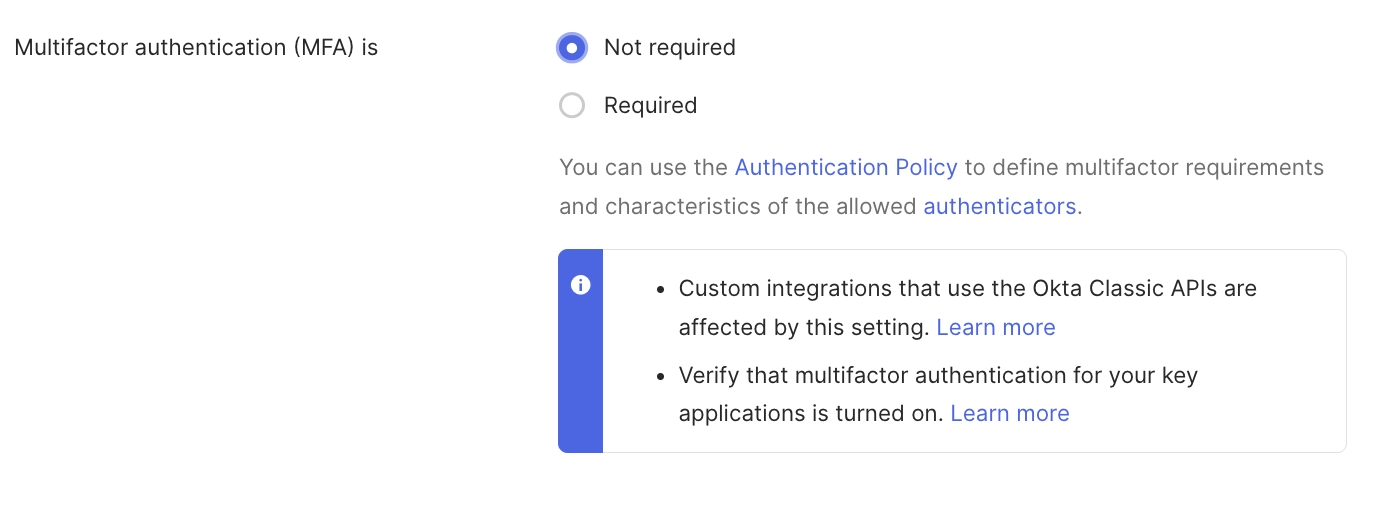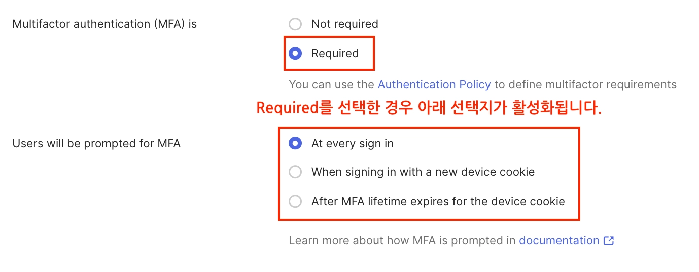 Users will be prompted for MFA: MFA를 “Required”로 선택한 경우 활성화됩니다.