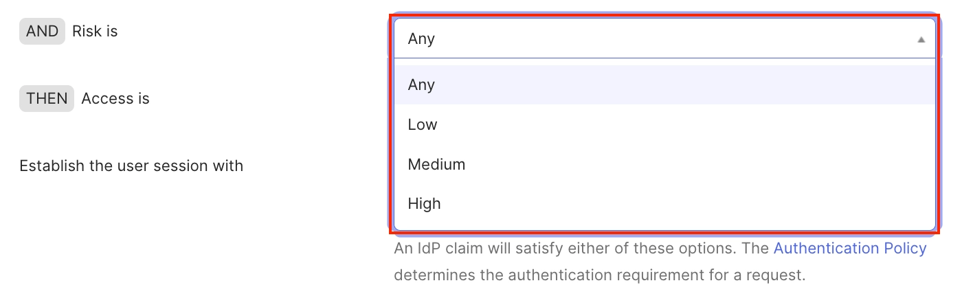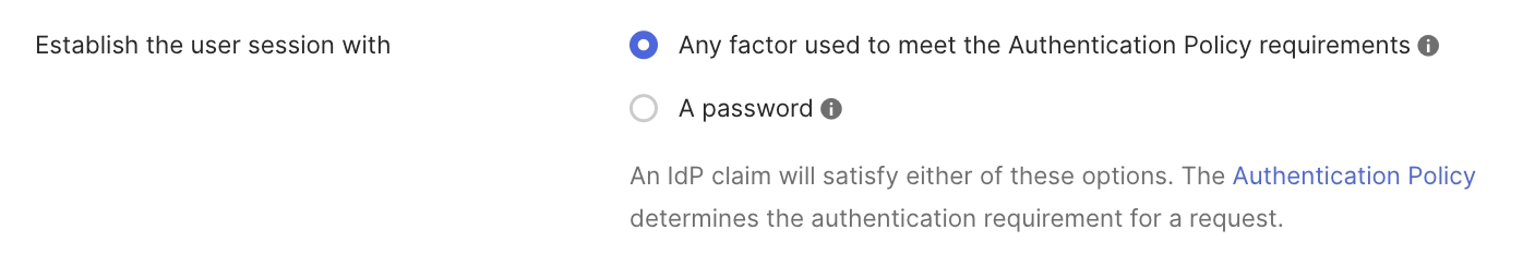 Any factor user to meet the Authentication Policy requirements: 앱 로그인 정책에 포함된 인증수단을 사용자 세션에 설정하도록 요구