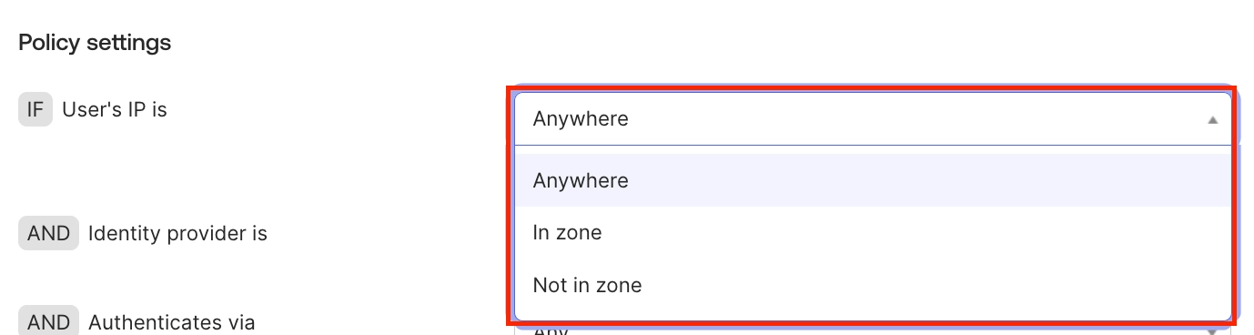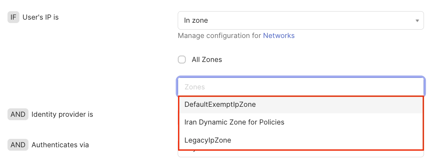 In zone, Not in zone을 선택한 경우, Network에서 지정한 zone(DefultExmptlpZone, Iran Dynamic Zone for Policies, LegacyIpZone)이 나오며 원하는 동적 IP 주소 zone이 필요하면 Network에서 zone 생성이 필요합니다. 네트워크 zone 생성이 필요한 경우 해당 글을 클릭하세요.