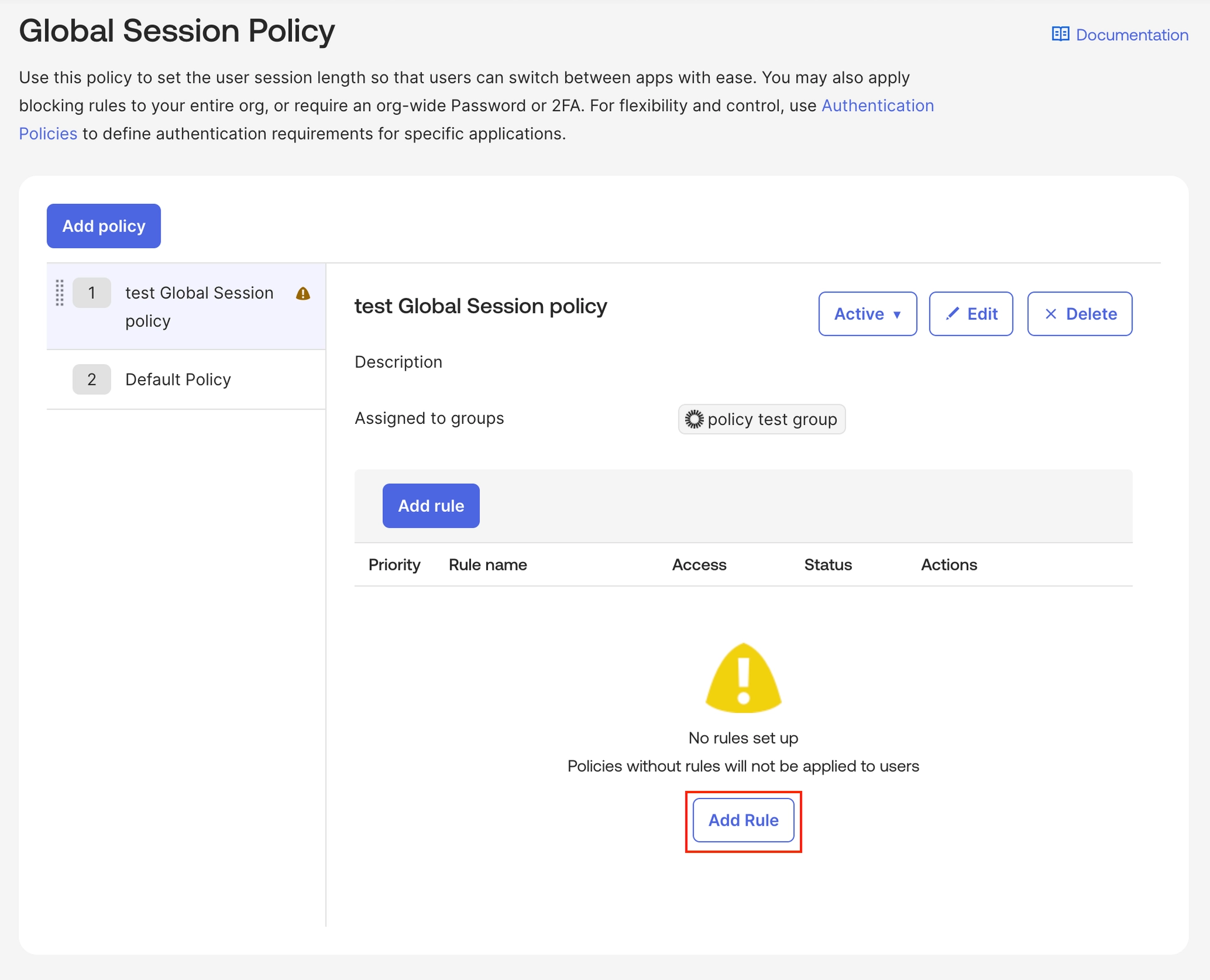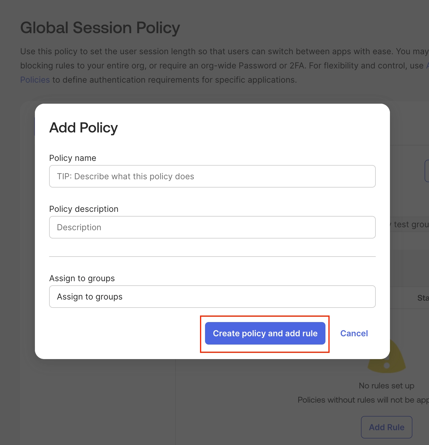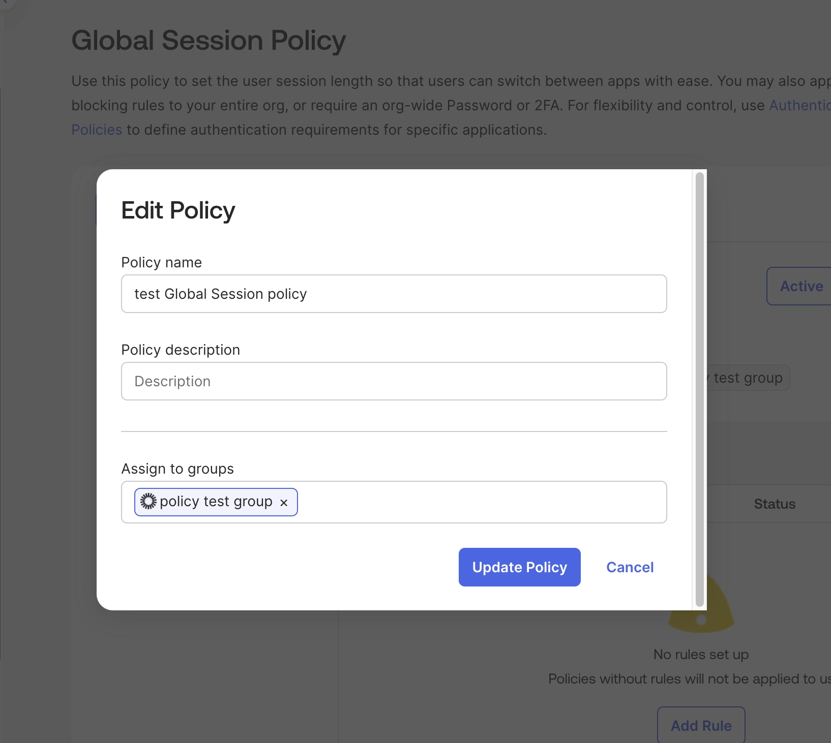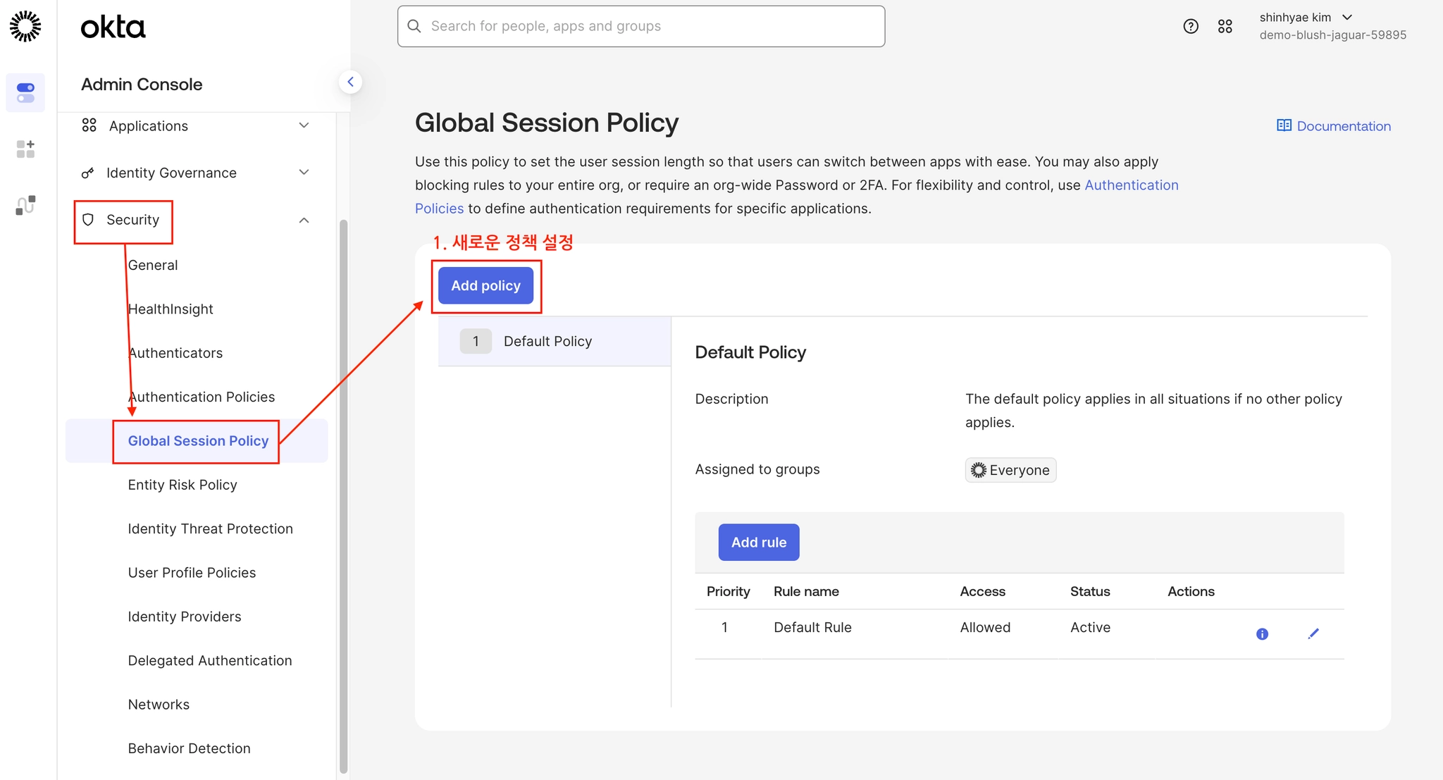 사용자가 Okta에 로그인한 이후 세션이 얼마나 유지되는지와 추가 인증(MFA) 요구 조건을 정의하는 정책