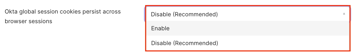 Okta global session cookie persist across browser sessions: 해당 옵션은 OktausePersistentCookie API 에서 해당 옵션을 설정한 경우에 나타납니다. 일부 브라우저 설정은 쿠키 수명에 영향을 미치고 이 설정을 무시할 수 있습니다.