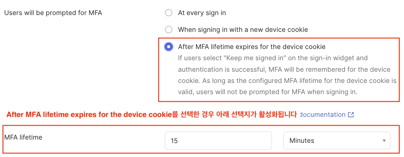 MFA lifetime: “After MFA lifetime expires for the device cookie”을 선택한 경우 활성화합니다.