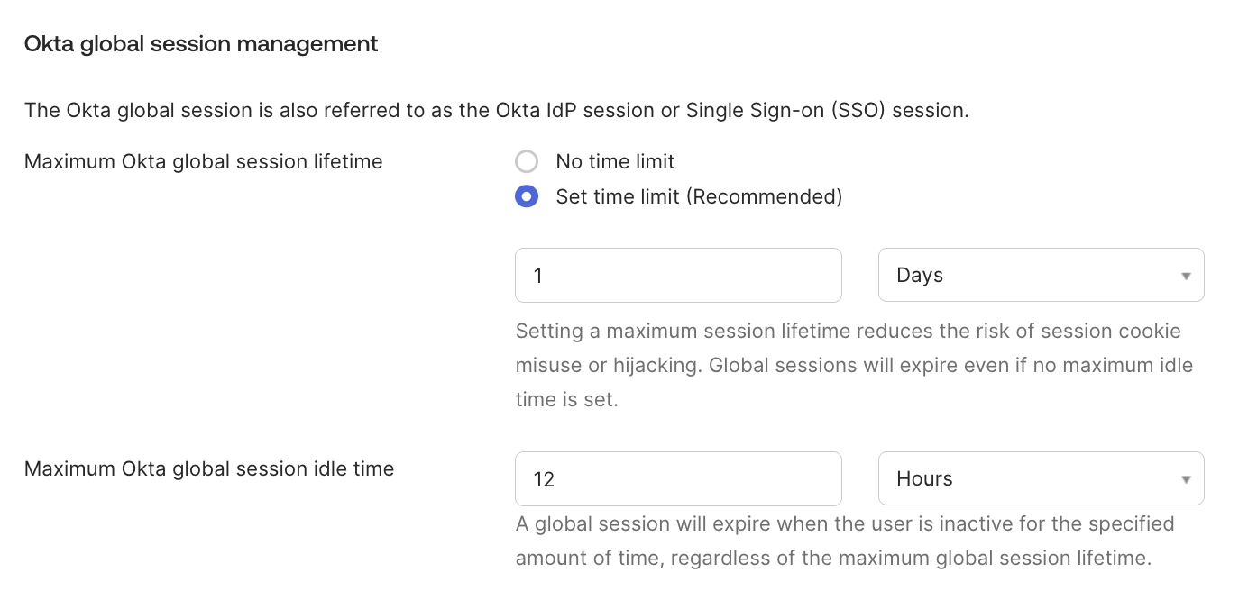 Maximum Okta global session lifetime: Okta 세션 지속 시간을 구성