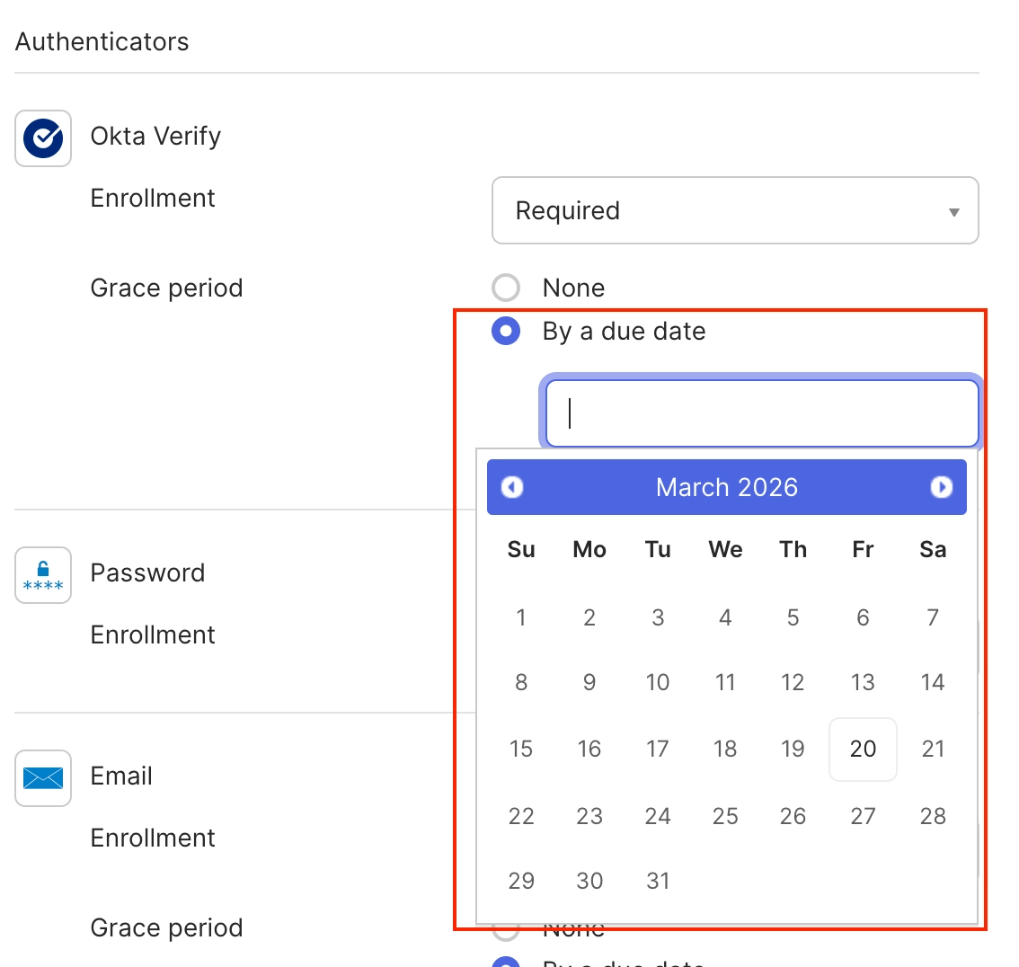 Grace Period: 사용자가 인증 수단 등록을 더 이상 연기할 수 없는 날짜를 설정할 수 있습니다. 이 날짜까지 사용자는 매일 한 번씩 인증 수단을 등록하라는 메시지를 받게 됩니다.