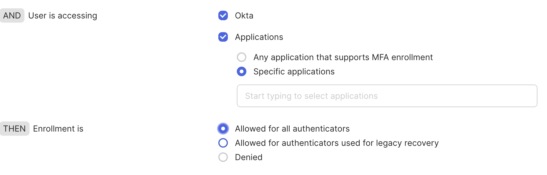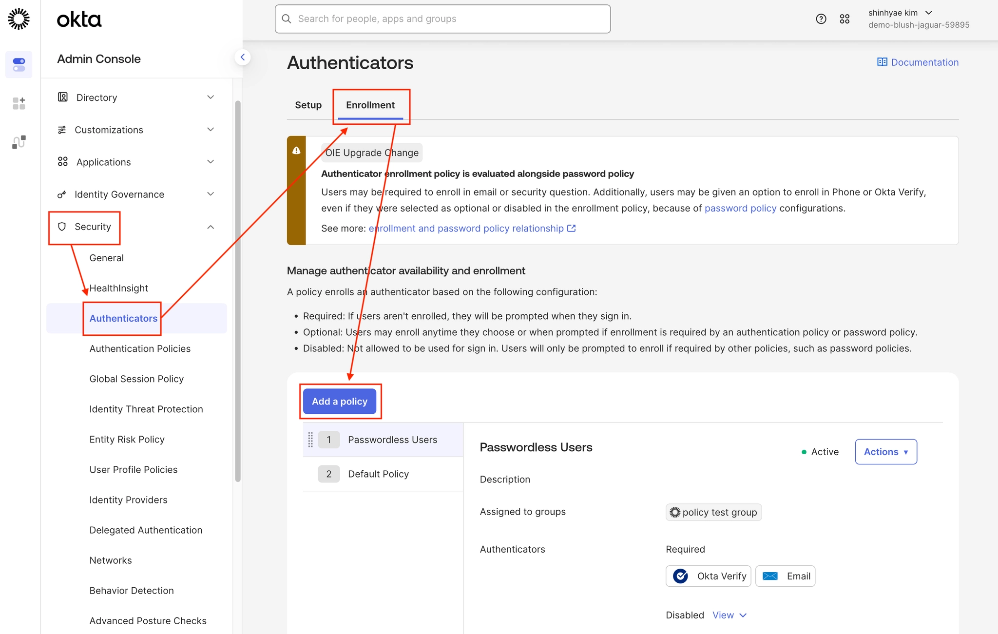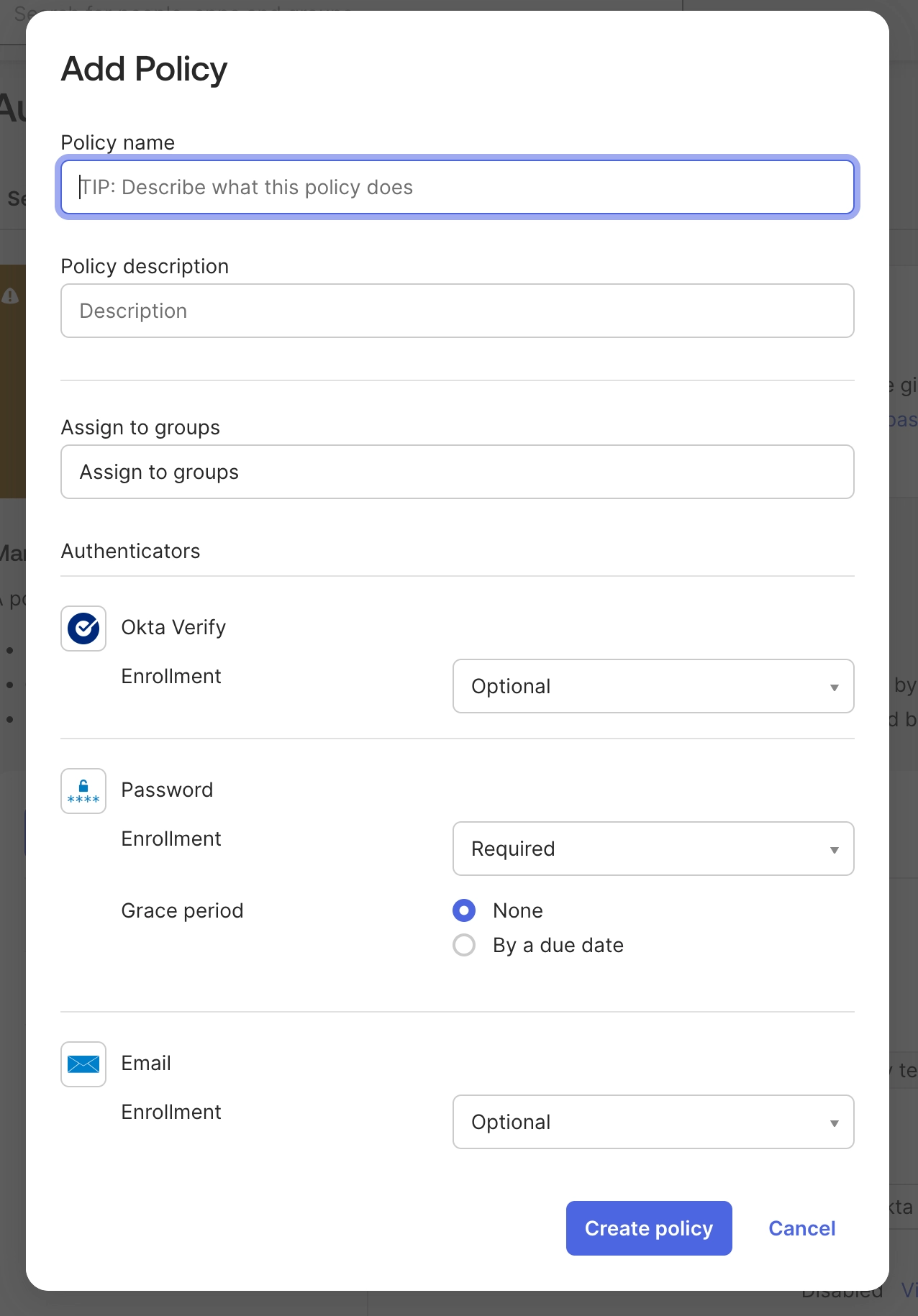 각 인증 수단(예: Okta Verify, SMS, FIDO2 등)에 대해 다음과 같이 설정할 수 있습니다.
