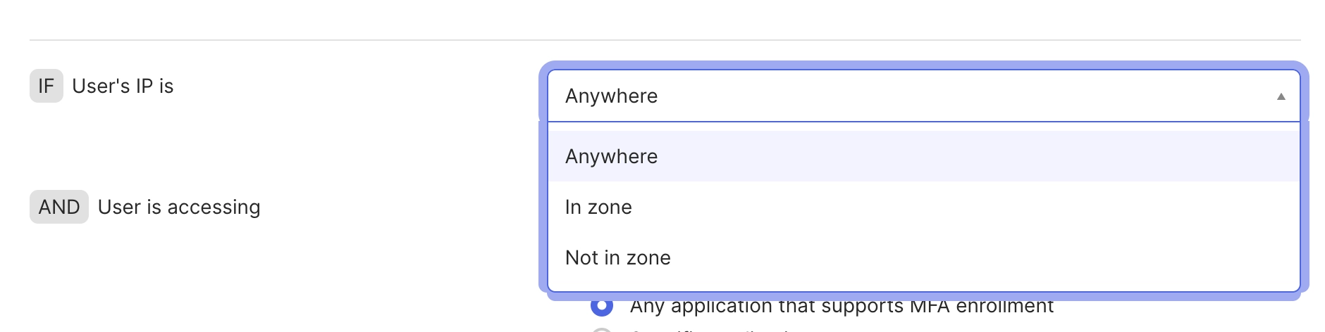 User’s IP is: Anywhere, In zone, Not in zone 중 어떤 경우에 인증을 표시할지 지정