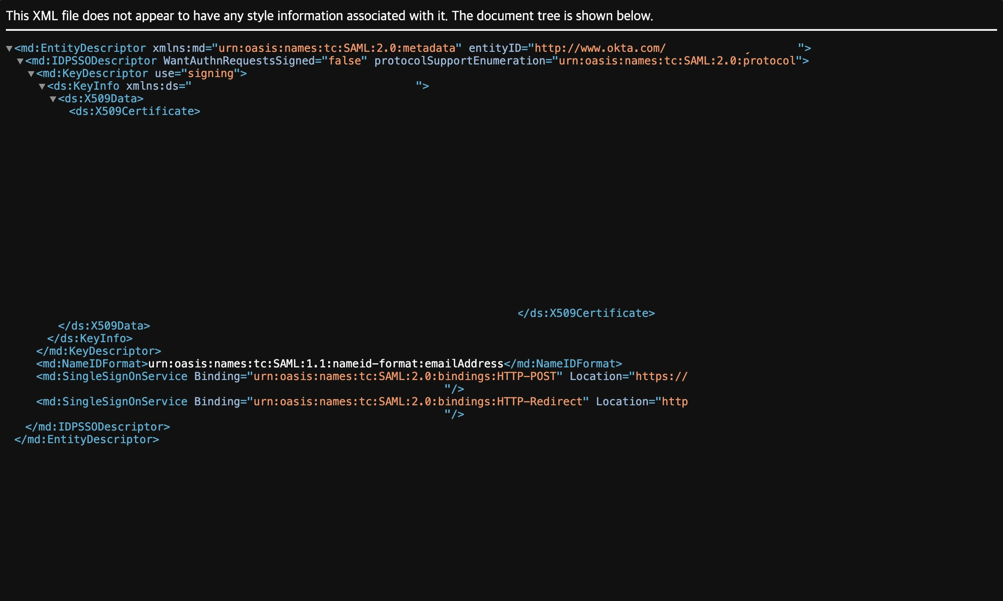 해당 파일에는 IdP SSO, Issuer URI, 서명 인증서가 모두 포함되있습니다.