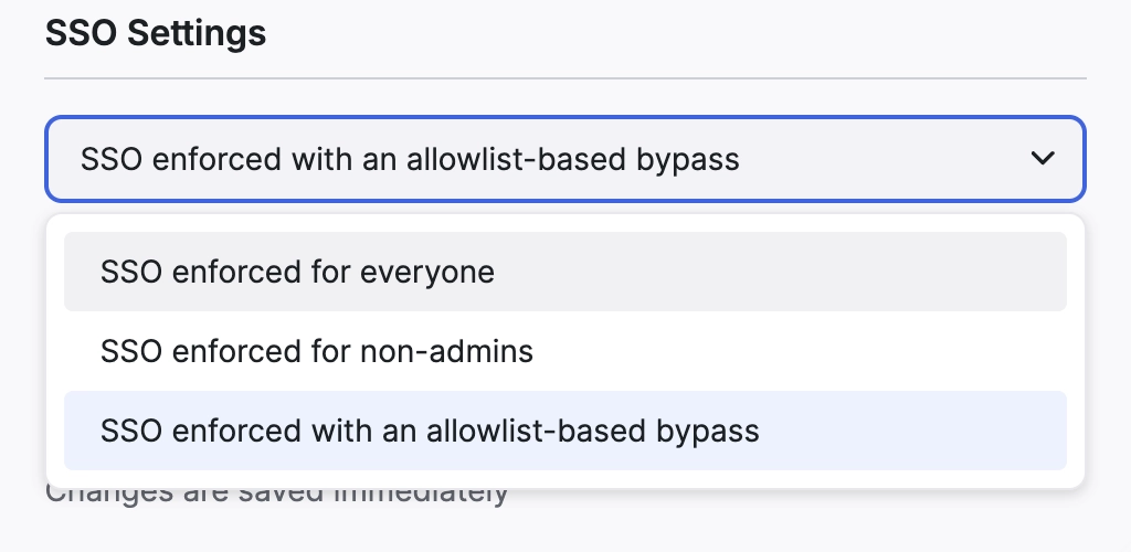 SSO enforced with an allowlist-based bypass: 기본적으로 전 사용자 SSO 적용, 단 지정된 사용자(Allowlist)는 SSO 우회 허용