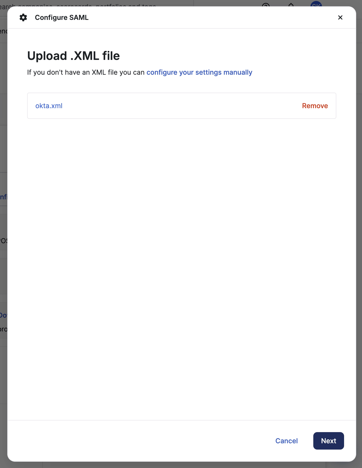 Okta에서 저장해뒀던 XML 파일을 업로드하고 “Next” 버튼을 클릭합니다.