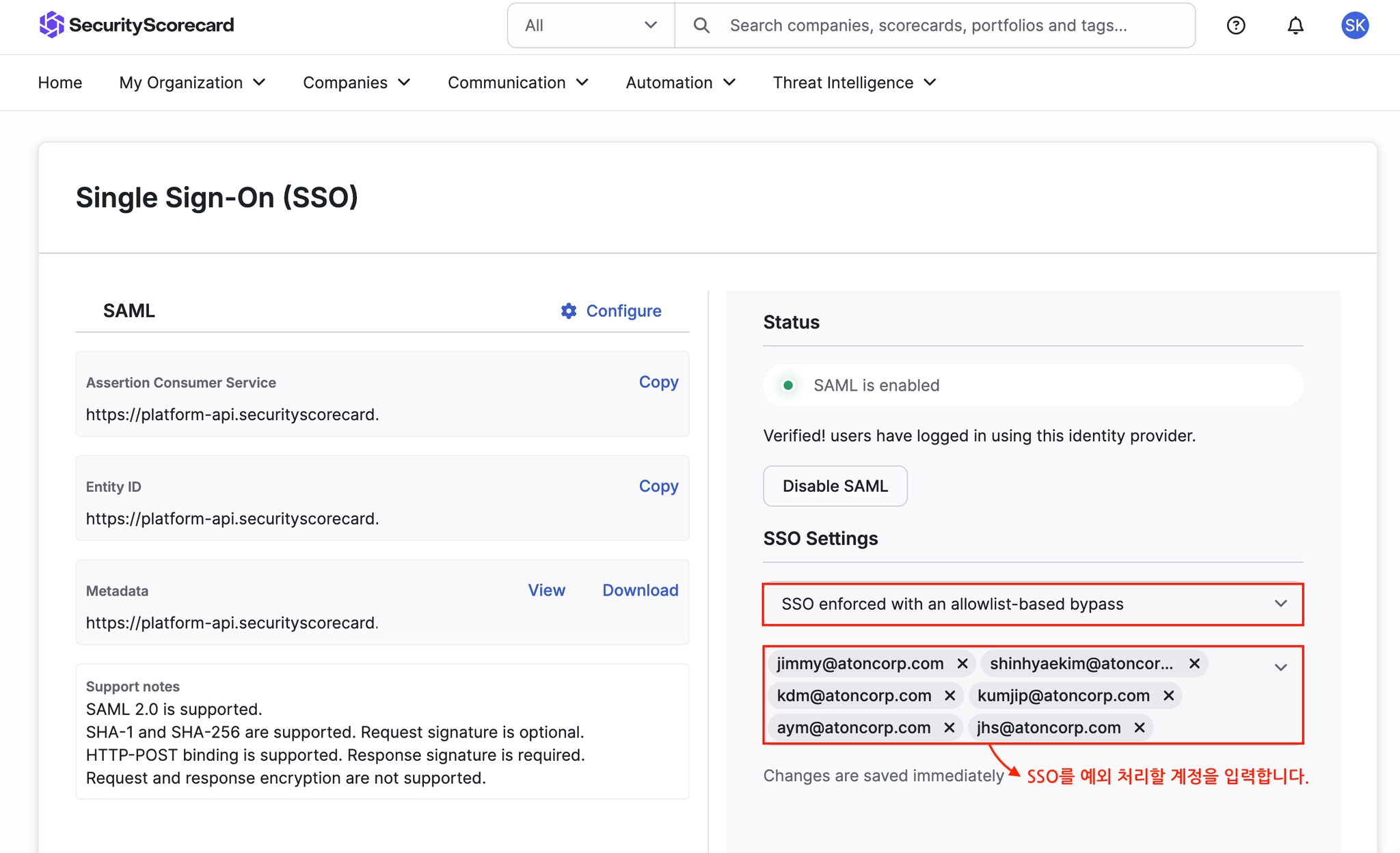 Step 4. Security Scorecard에서 SAML 설정 마무리